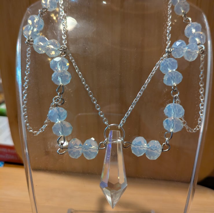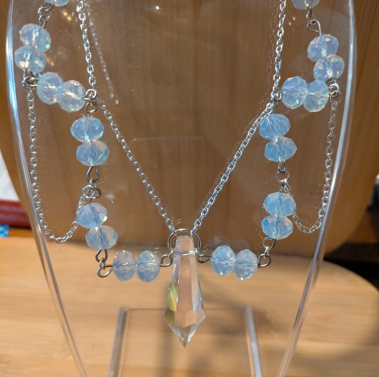 A silver coloured chain with white glass beads, hand crafted and in a fantasy style.