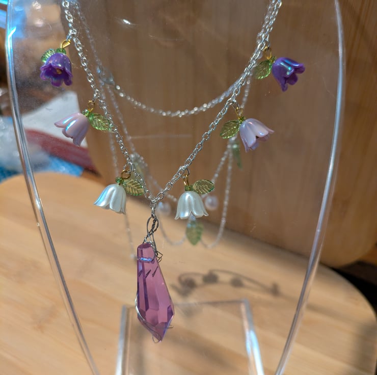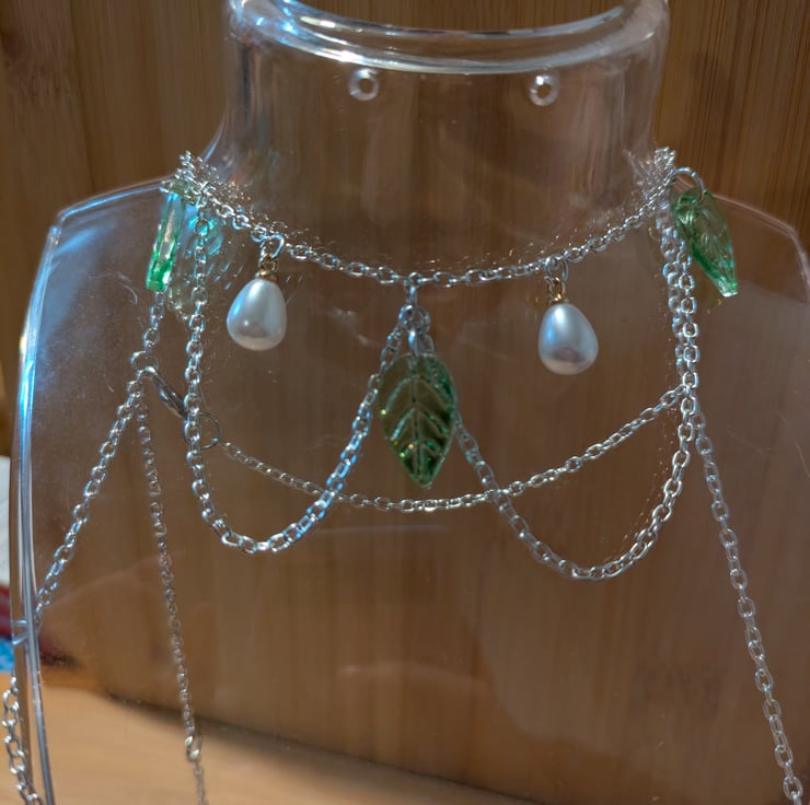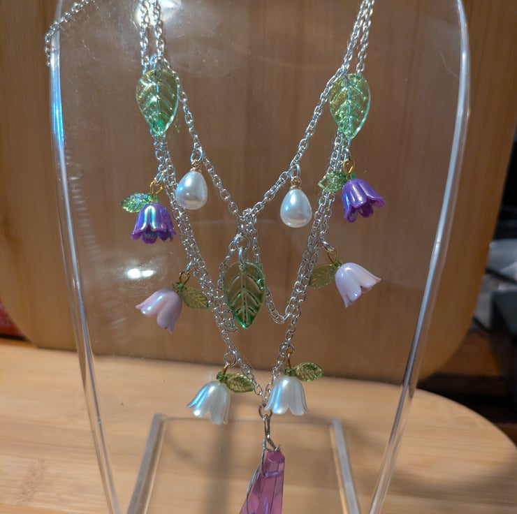A handcrafted necklace made from silver plated chain, acrylic and glass beads, all in a fantasy inspired necklace