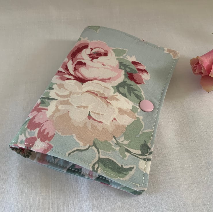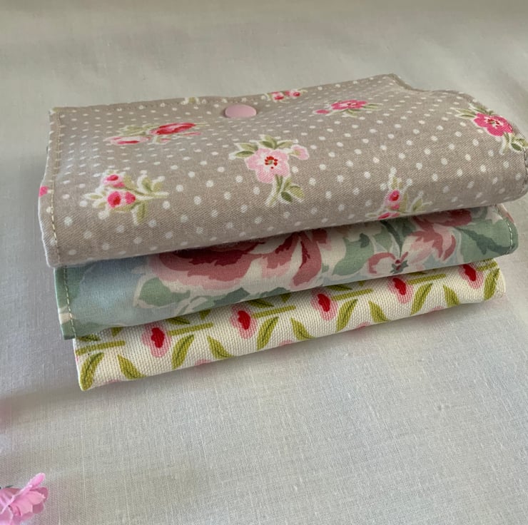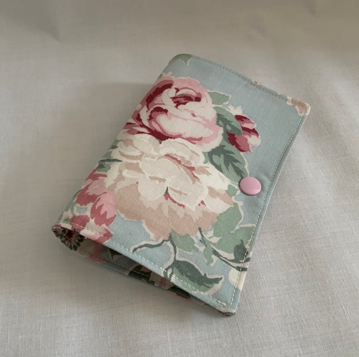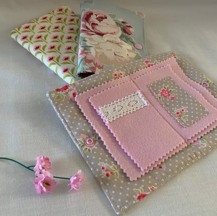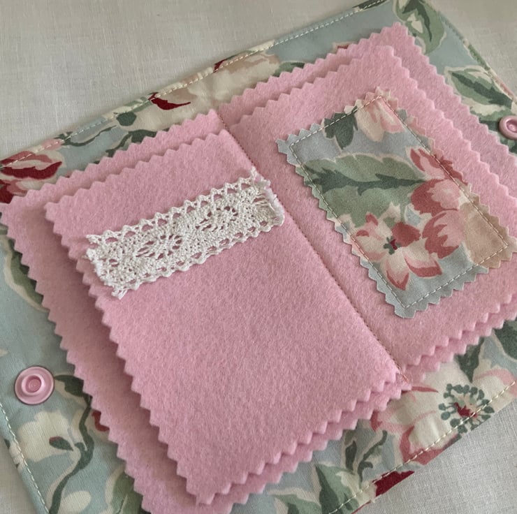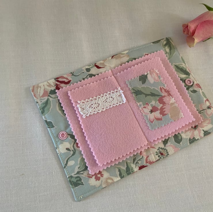 This beautiful handmade needle case is a charming and functional accessory for sewing enthusiasts. Inside, the case offers four felt pages, two with some decorative embellishments, which are perfect for organising your needles or pins. The case closes securely with a plastic snap fastener.