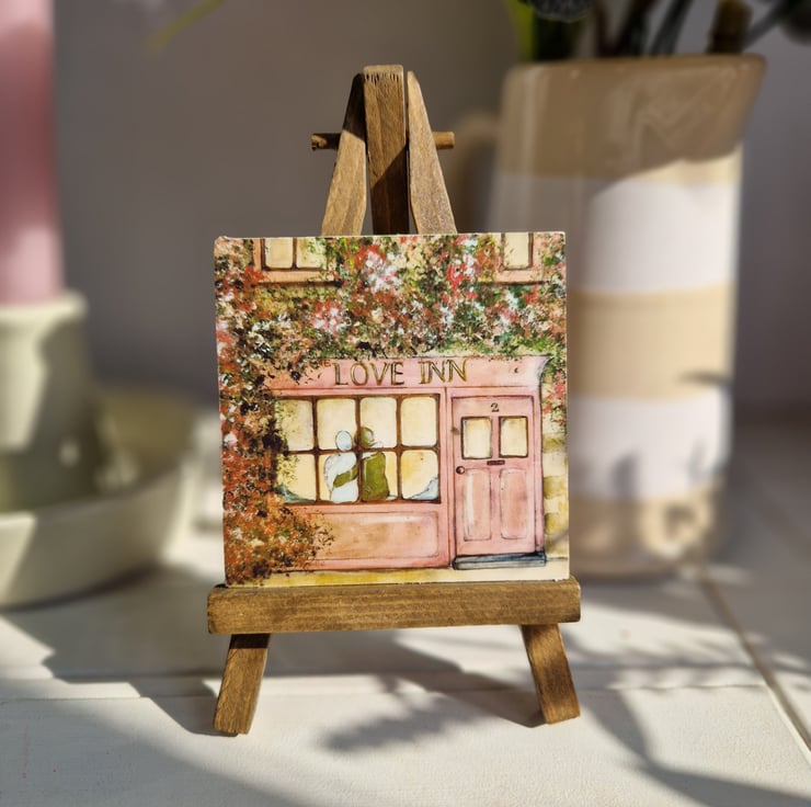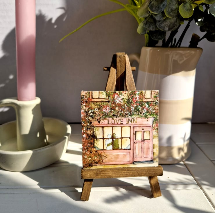 Beautiful miniature artwork printed on a little wooden square with matching wooden easel.