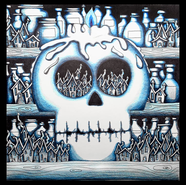A pen and ink illustration of an old apothecary shop, with bottles, ,poisons, candles and a skull. A witches storeroom.