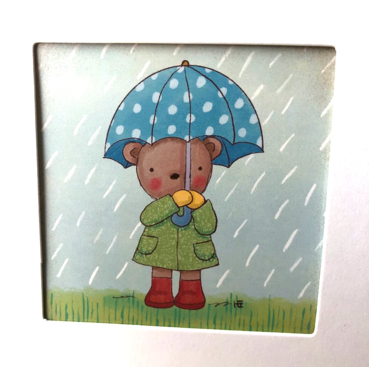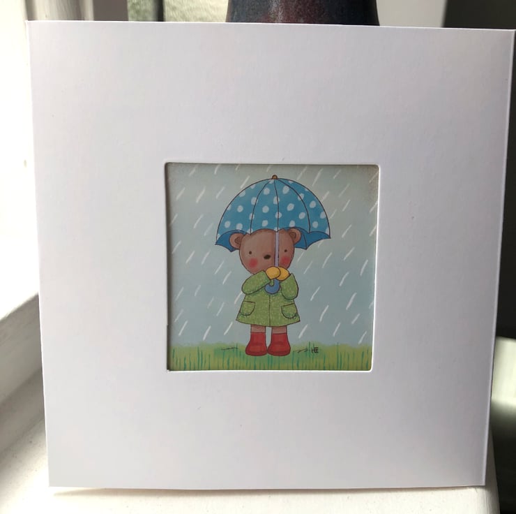 Get well card, feeling under the weather card featuring a cute bear under his blue white polka dot umbrella in the rain.