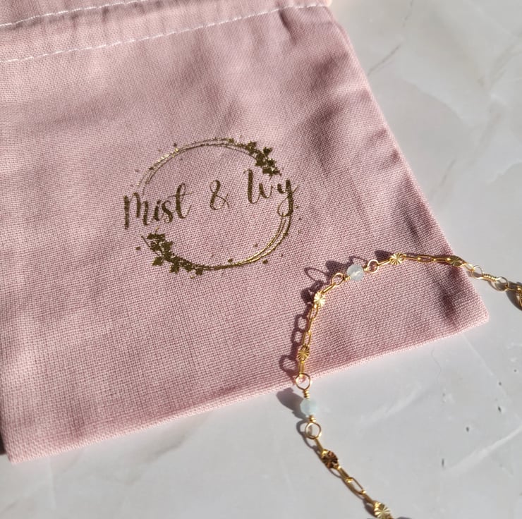 This bracelet comes packaged in a rose coloured, eco friendly pouch, made from organic cotton with 100% cotton drawstrings. Storing your jewellery in its pouch will protect it, and help to keep it shiny and in good condition.
