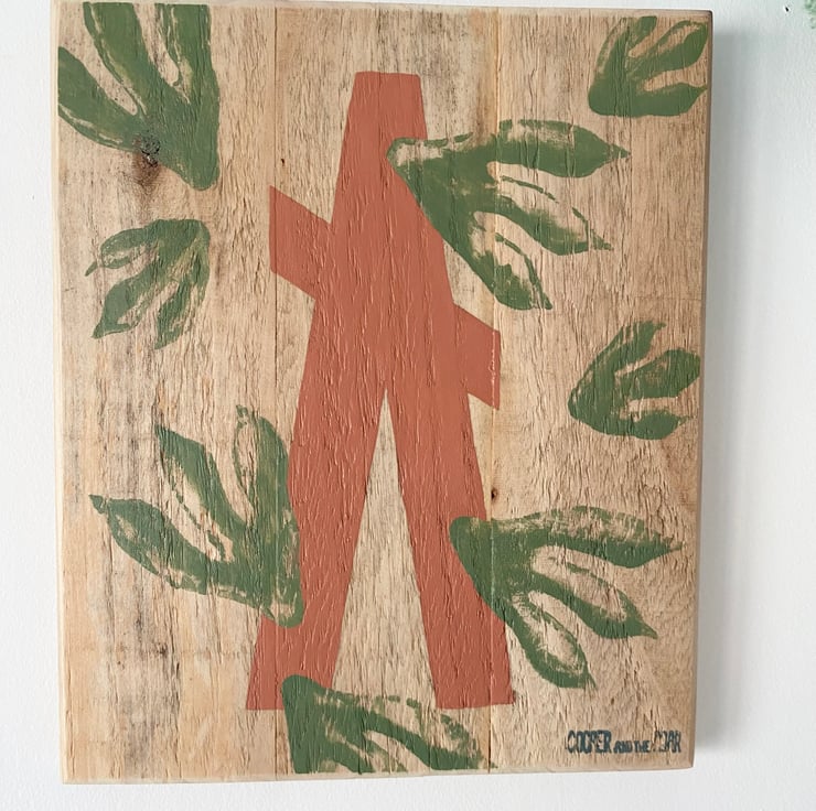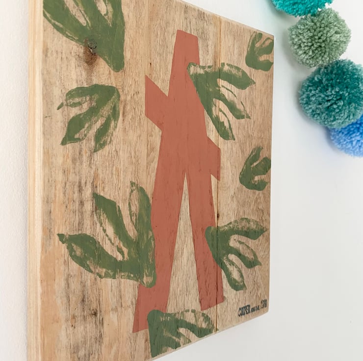 Beautiful initial dinosaur footprint wooden sign with natural wood background, footprints are hand painted in F&B Calke Greenand initial letter is in F&B Red Earth.