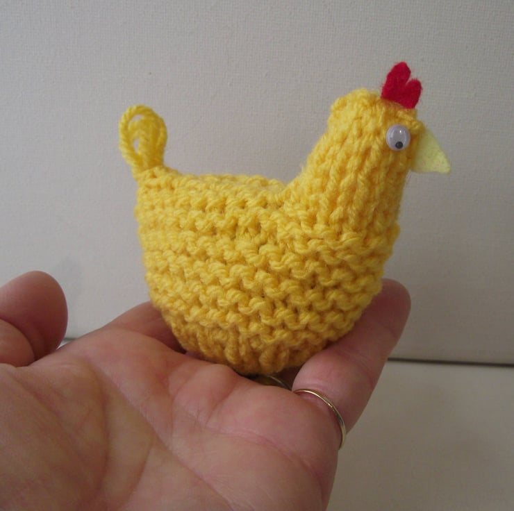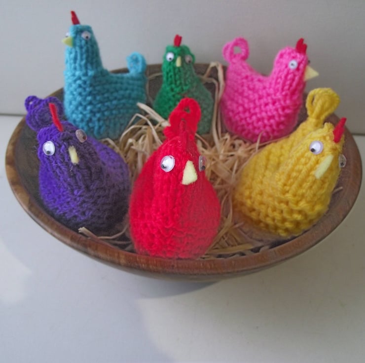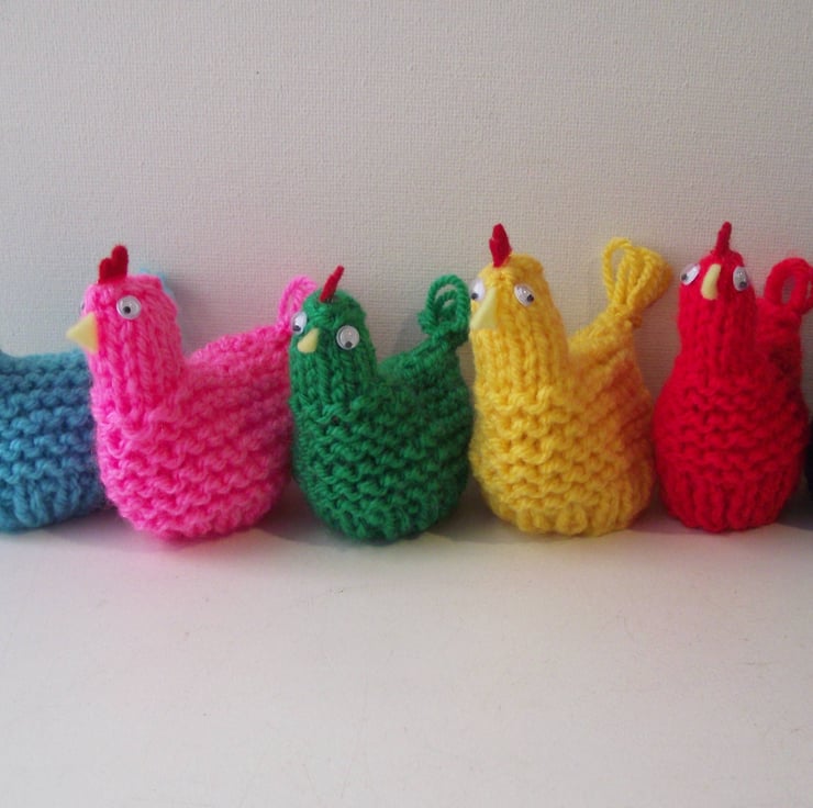 I knitted these cute Easter chickens in premium acrylic yarn, adding felt combs and beaks and small googly eyes. They are the perfect size to be used as egg cosies, with chocolate eggs inside as part of an Easter egg hunt, or as part of an Easter display.