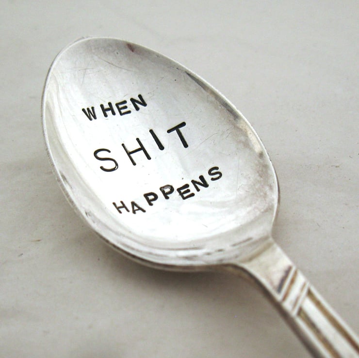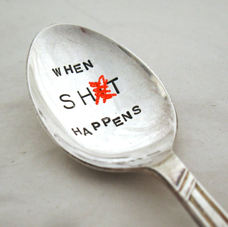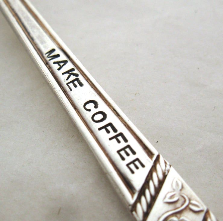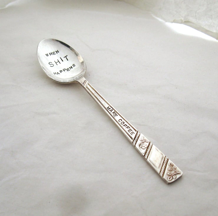 A hand stamped vintage floral coffeespoon with the words WHEN S--T HAPPENS in block lettering in the bowl, and the sage advice MAKE COFFEE on the handle. The perfect small gift for a coffee-lover!