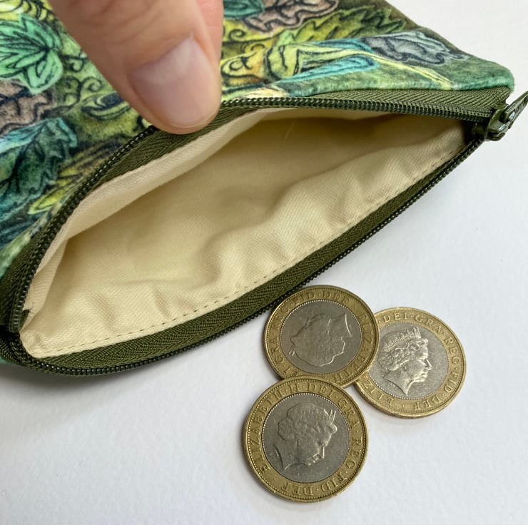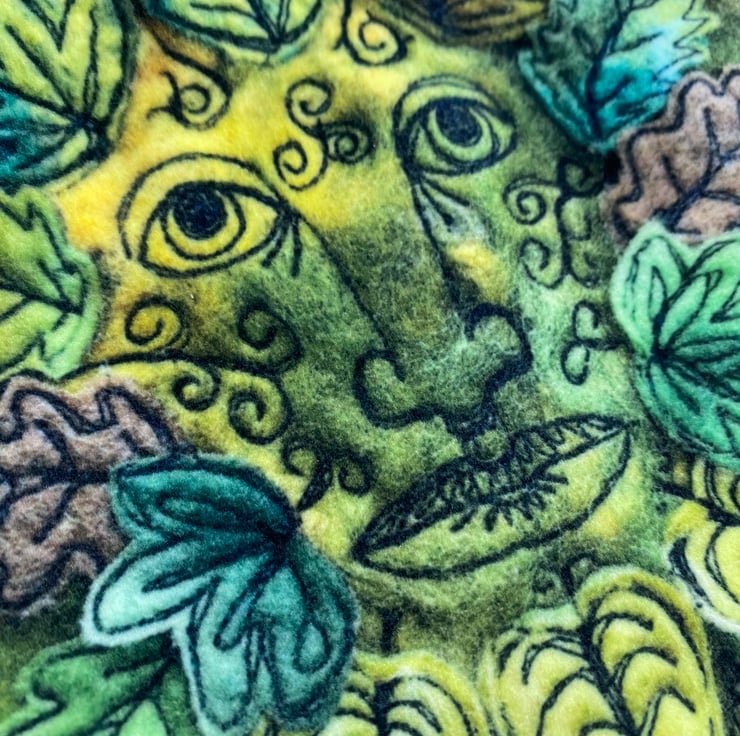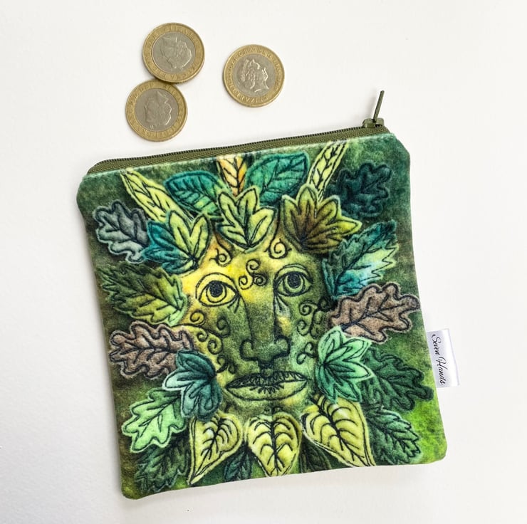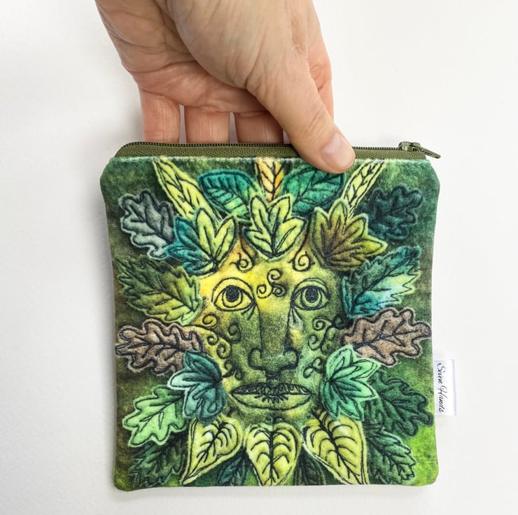 This highly versatile gorgeous zip bag is decorated with a print of one of my felted pieces. A stunning 3 dimensional Green Man. It has a cotton lining and various matching coloured zips. The print is on the front and back.