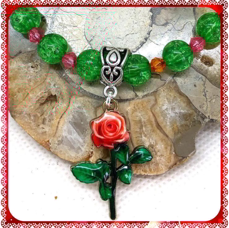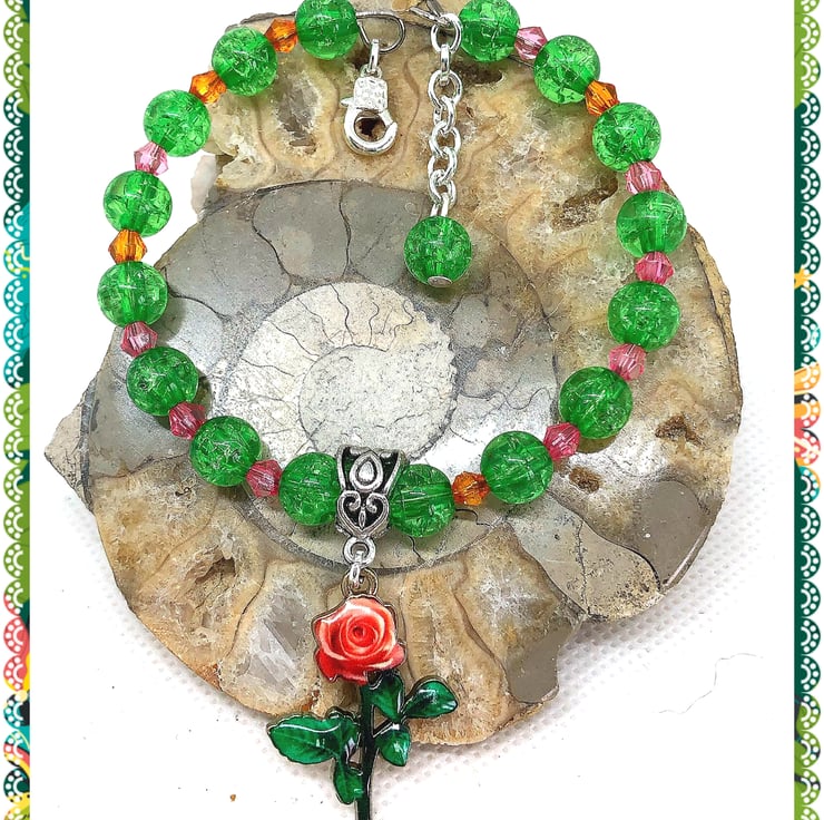 Created using this pretty enamelled rose, green crackle glass beads & pink spacer beads threaded onto stainless steel memory wire with Tibetan silver bail, lobster clasp with an extension chain. Adult size. Nickel free