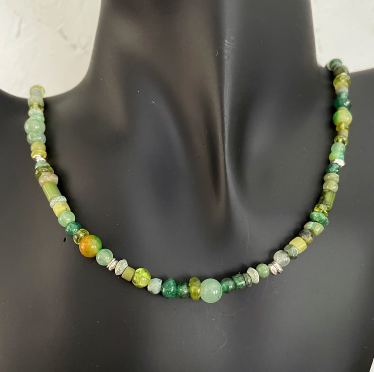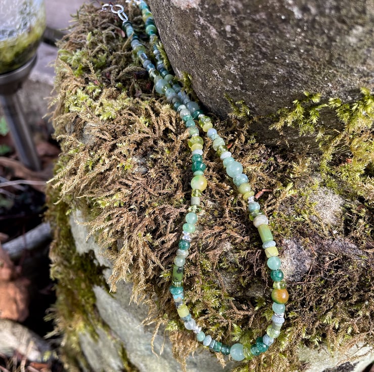 A colourful gemstone and silver small bead necklace with silver clasp. Adjustable length.