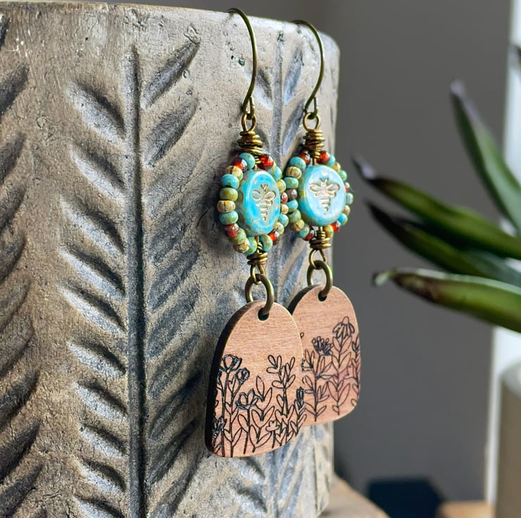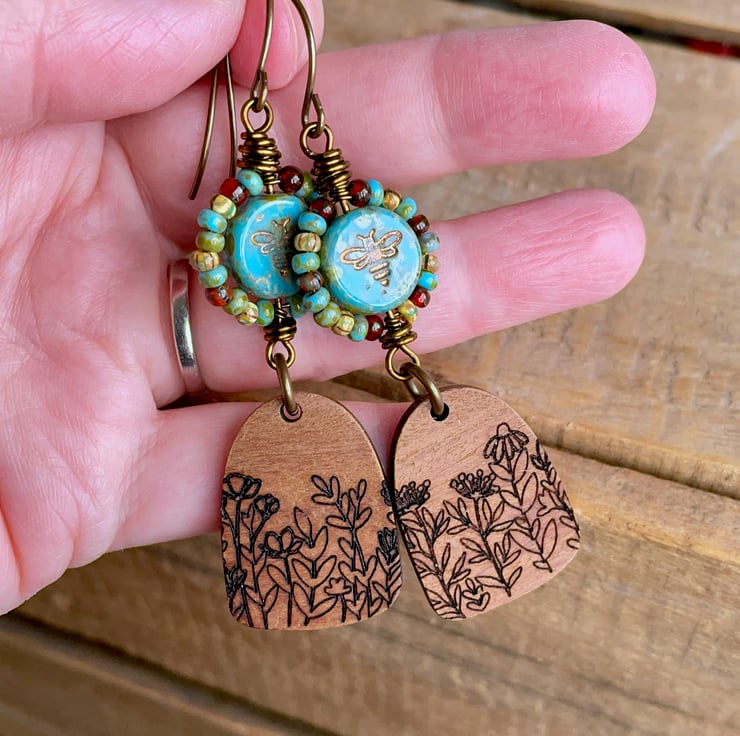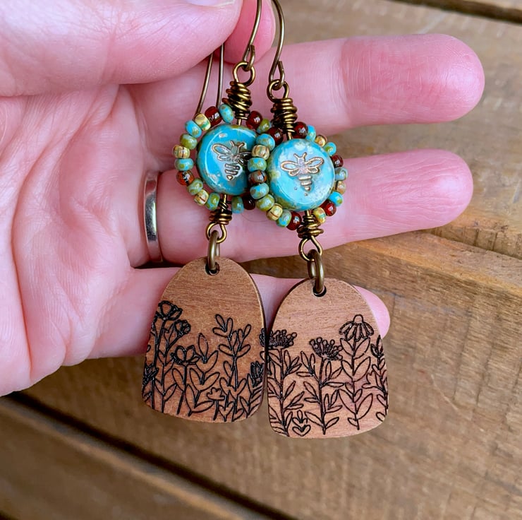 Bohemian-style earrings featuring large yet lightweight wooden charms, decorated with a beautiful wildflower design.