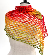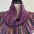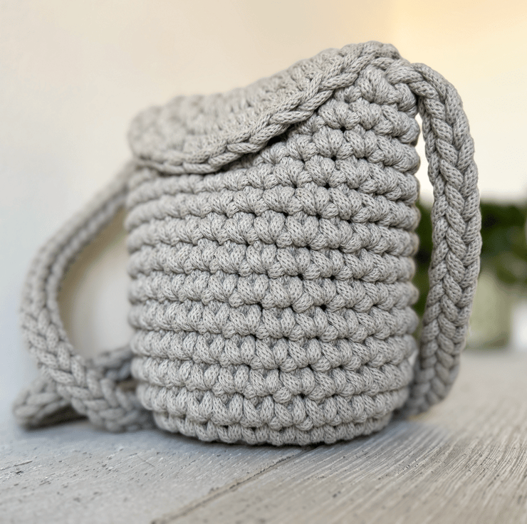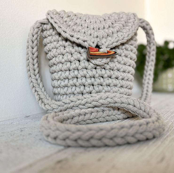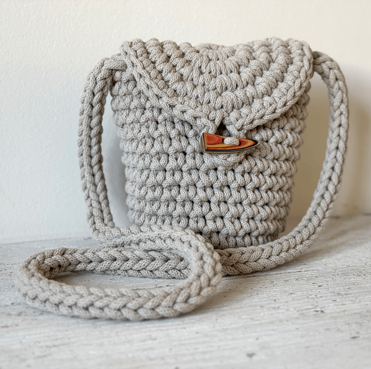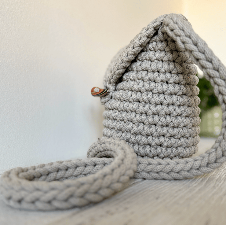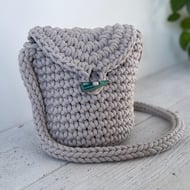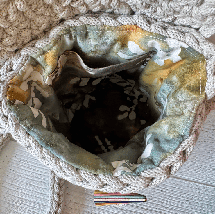 This is a handmade bag crocheted from recycled cotton cord and lined with cotton fabric shown in detail in images above. It has an internal patch pocket and fastens with a wooden toggle.
