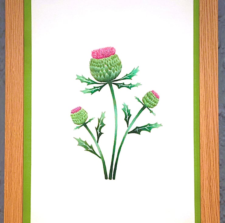 Framed high-quality coloured A3 print of my painting of purple/pink thistles on a white background with a hard backing. The print comes finished with a vibrant, stylish light green border. Framed with an expensive Styrene Protective Perspex (which has same clarity of glass) ready to hang. Choose from three different types of frame; black, oak or dark oak(see images). Colours of print and border may differ slightly due to computer/phone settings. All purchases delivered within 7-10 working days.