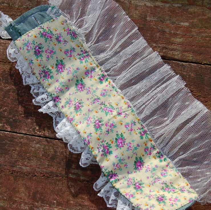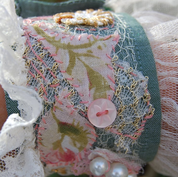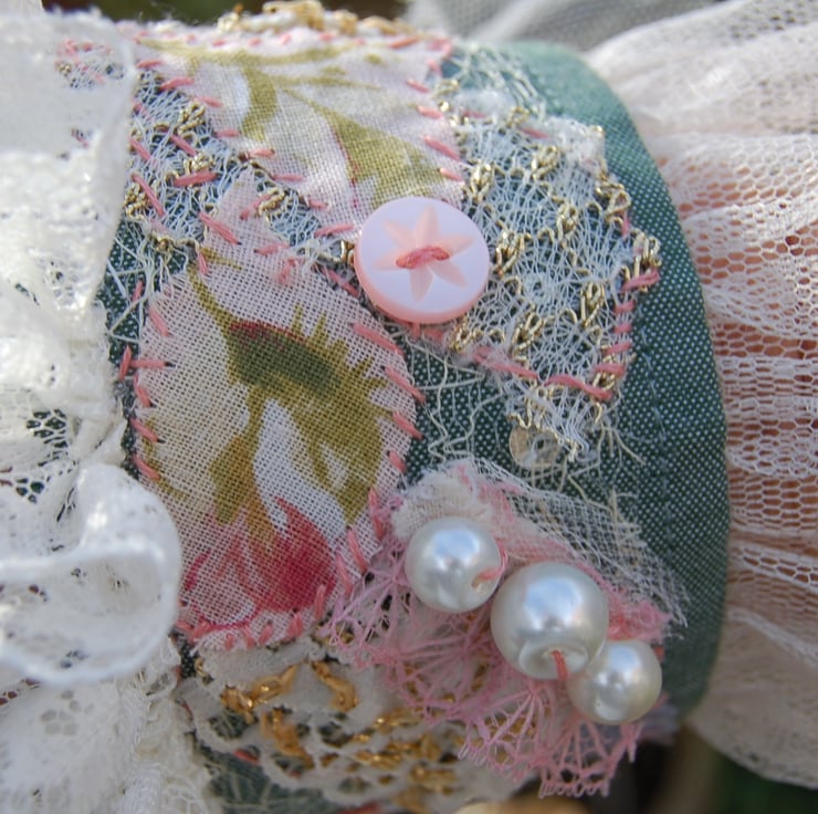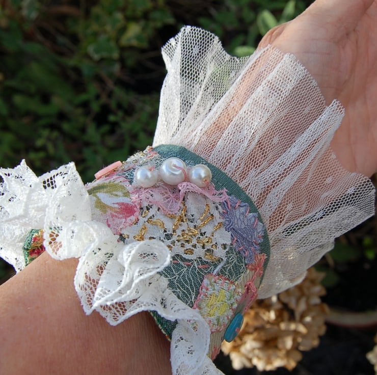 A beautiful romantic style hand made cuff bracelet made using a selection of vintage and new fabric remnant. All hand stitched.
