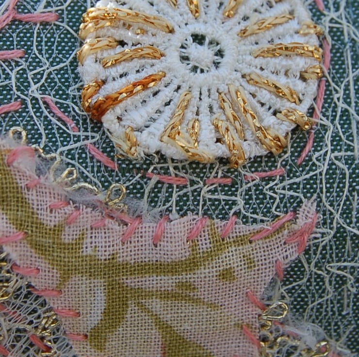 The base is an unwanted cotton shirt cuff (how cool is that). I've layered lace and small oddments of lace and fabric to create this one of a kind cuff bracelet. All hand stitched with lots of embroidery details in pink and gold. Backed with a pretty floral fabric.
