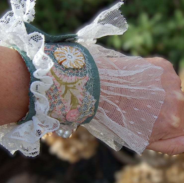 Upcycled Textile cuff bracelet - lace, beads, embroidery. Hand stitched.