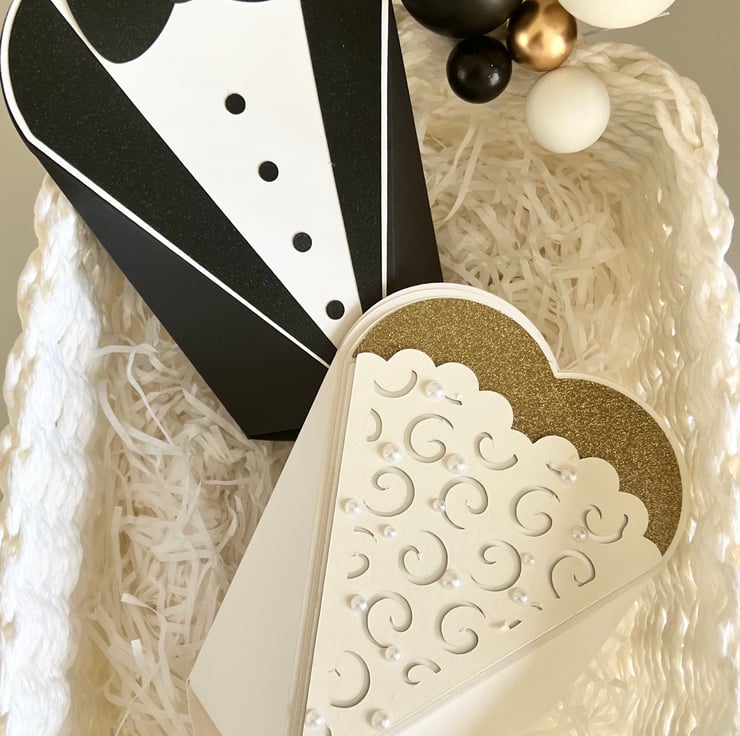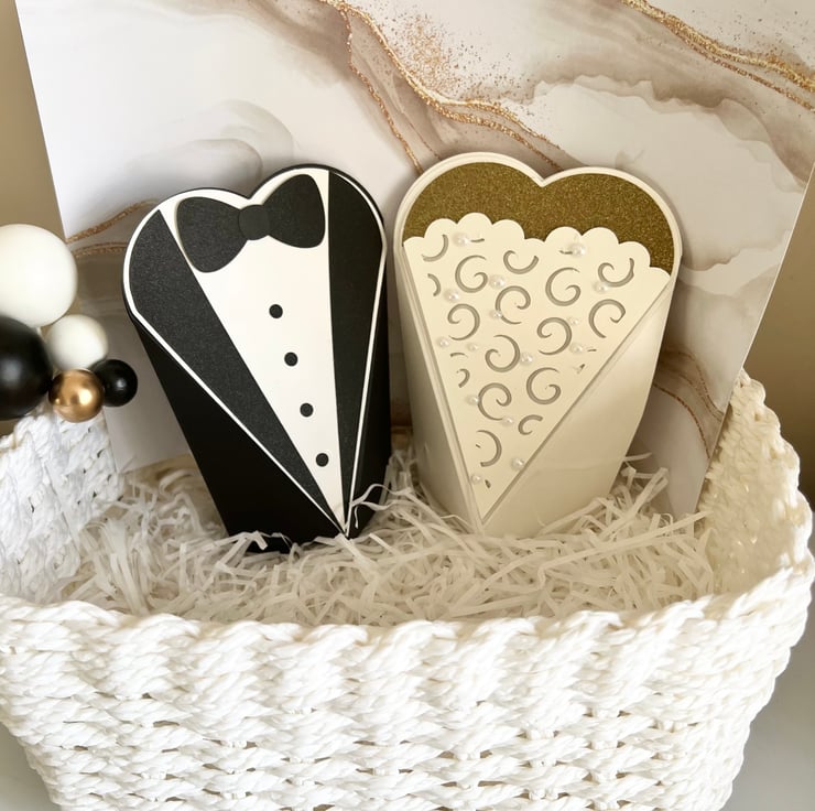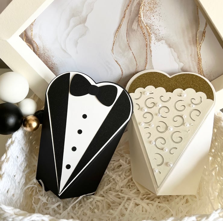 Make your wedding day extra special with these beautifully handcrafted wedding favor boxes, designed in the shape of a bride’s dress and groom’s tuxedo. These stylish heart-shaped boxes are perfect for holding small treats, chocolates, or wedding keepsakes for your guests.