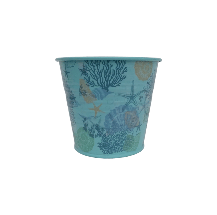 Bring a touch of coastal charm to your indoor space with this beautifully handmade decoupaged tin plant pot. Featuring an elegant sea shore design with intricate starfish, coral, and seashell patterns, this decorative piece is perfect for adding a refreshing beachy vibe to your home décor.