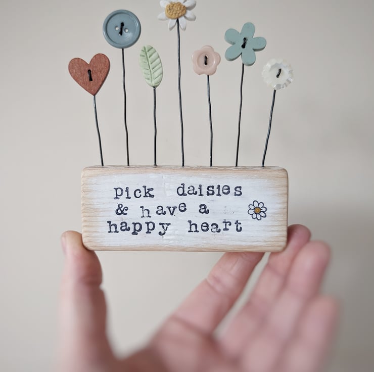 The little hand stamped words on the front say 'pick daisies & have a happy heart'