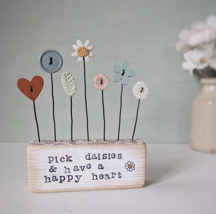 Button flowers grow in a row in this little garden with a clay leaf, and flowers. They stand on their wire stalks in a wooden block with a decoupaged floral top.