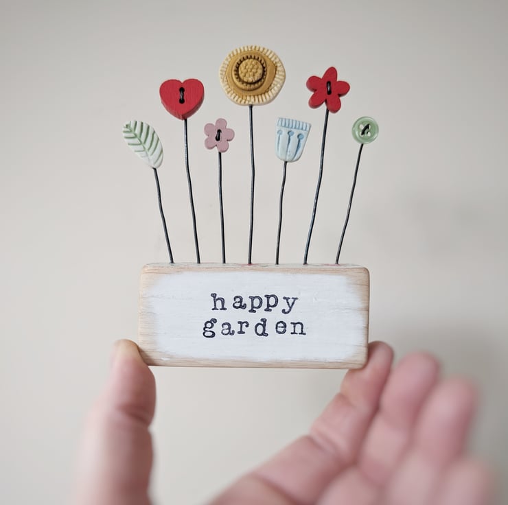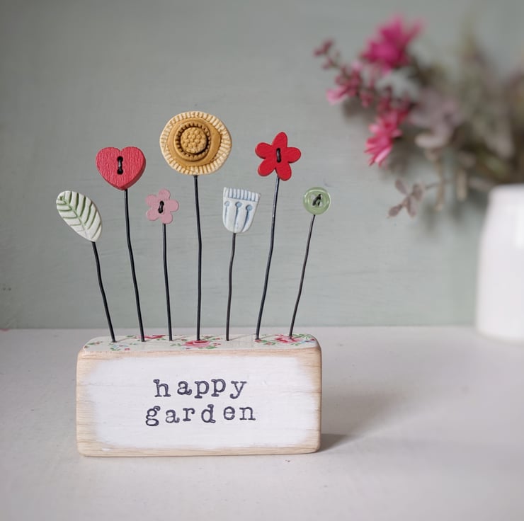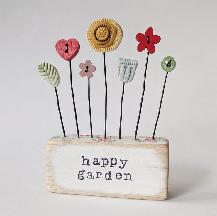 Button flowers grow in a row in this little garden with a clay leaf and flowers. They stand on their wire stalks in a wooden block with a decoupaged floral top.
