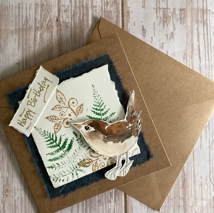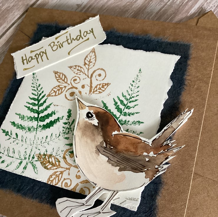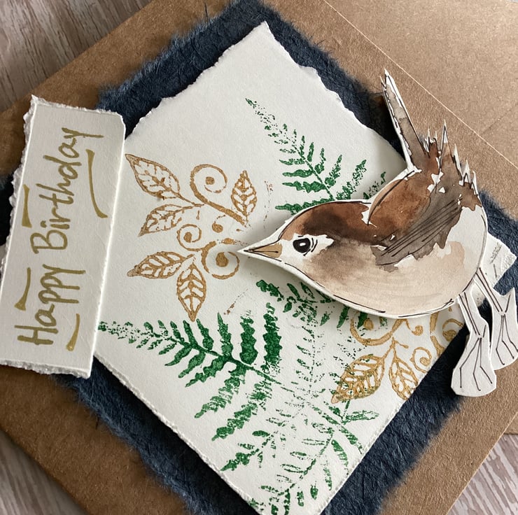 A handmade, nature inspired card, featuring original artwork, a watercolour wren. Cut out and mounted with foam pads, the wren stands out in a lovely three dimensional effect. The background is hand stamped ferns and gold flourishes, adding a touch of woodland charm.