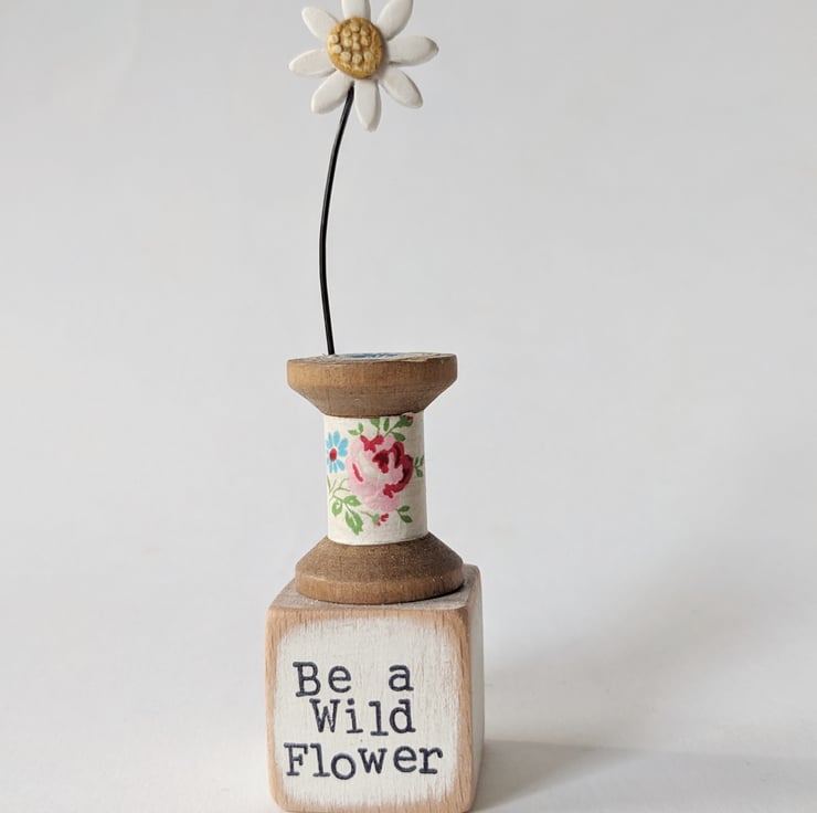 The painted block beneath has the hand stamped words 'Be a Wild Flower'