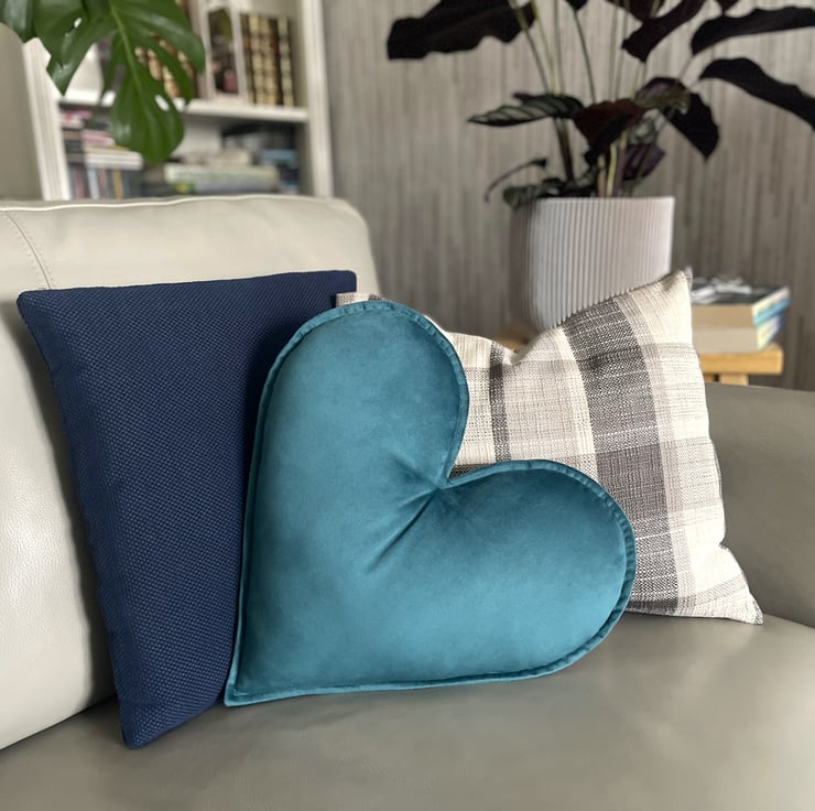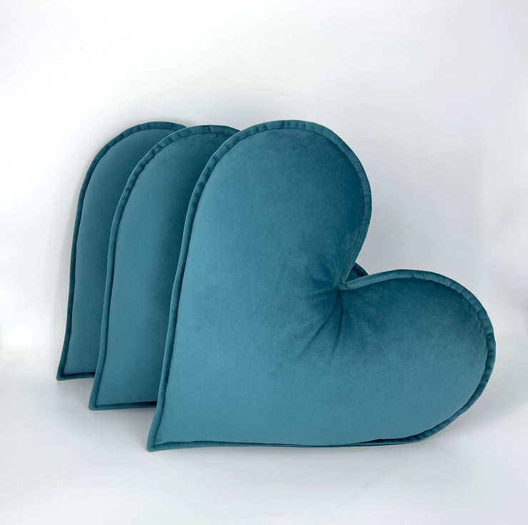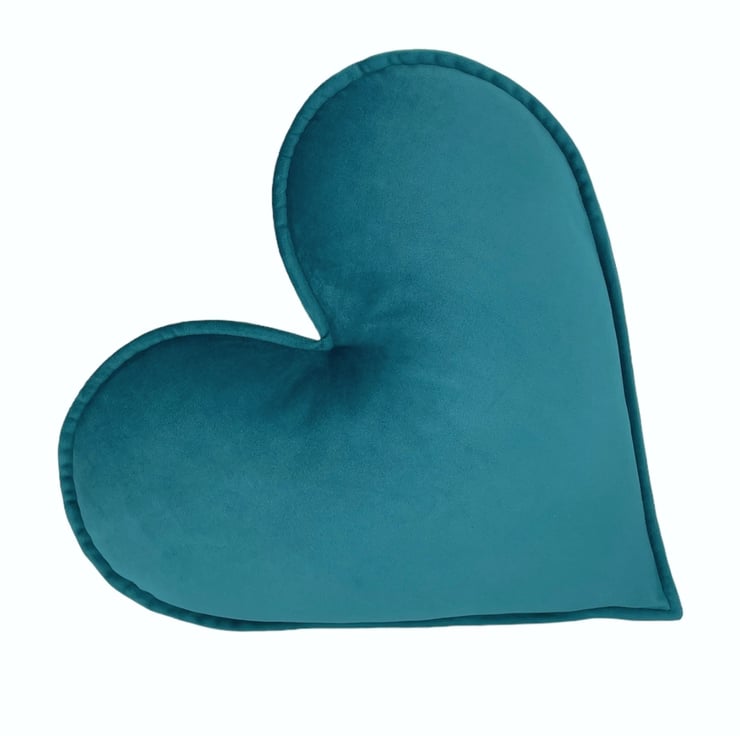 Add a pop of color and elegance to your space with this heart-shaped cushion in stunning teal blue velvet!
