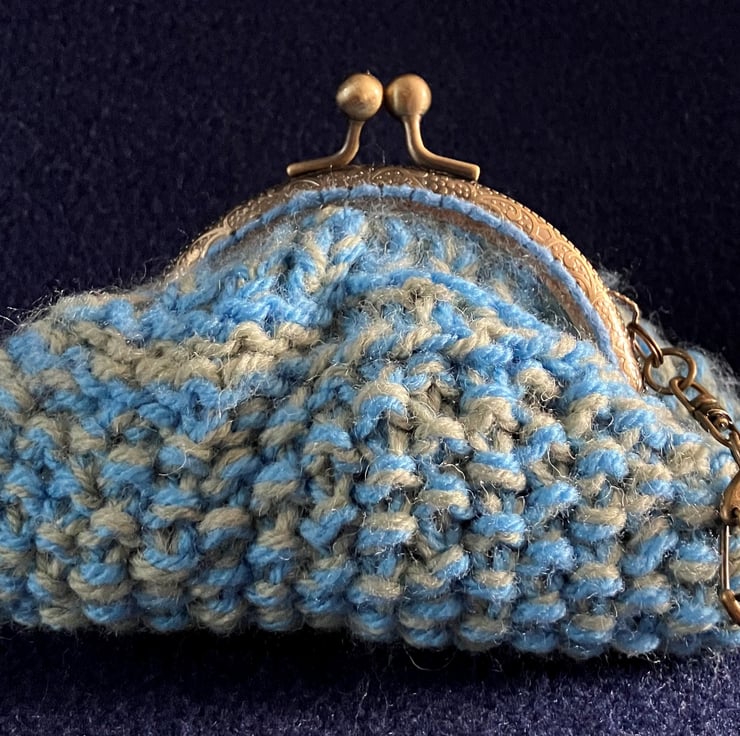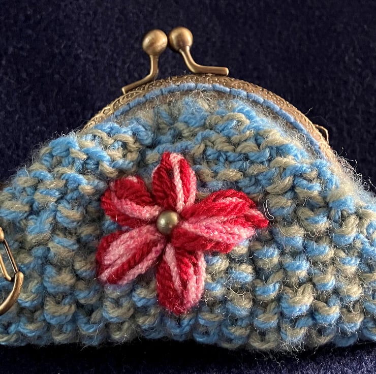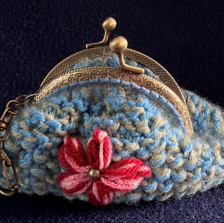 This purse has a centre bead, metal click shut clasp and a metal clip.