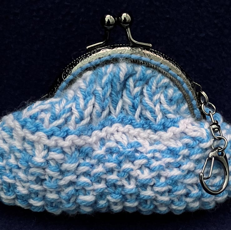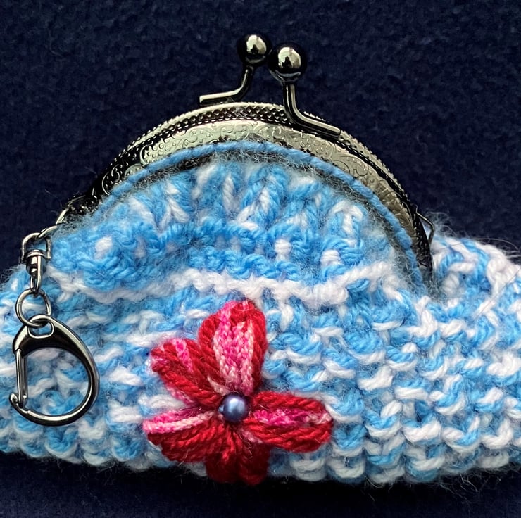 This purse has a centre bead, metal click shut clasp and a metal clip.