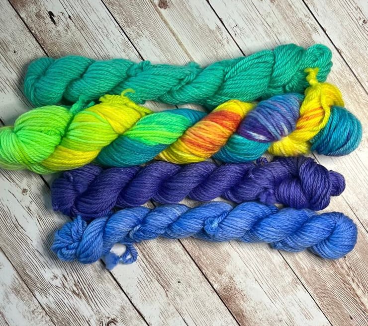 100 % superwash merino. Hand dyed by me. 1 x 50 gm skien with 3 x 50 gm skien. Ideal for stash building and scrappy knits.