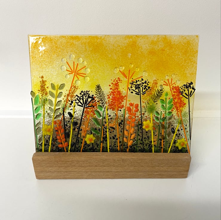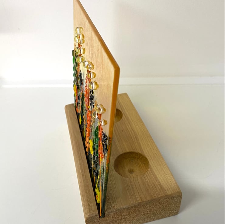A gorgeous way to add warmth and interest to your home . The fused glass panel is twice fused to build up glass powder and sheet glass in my kiln . The panel then slots into an oak base which duals in the evening as a candle screen . A perfect gift which comes apart for easy transportation and cleaning.