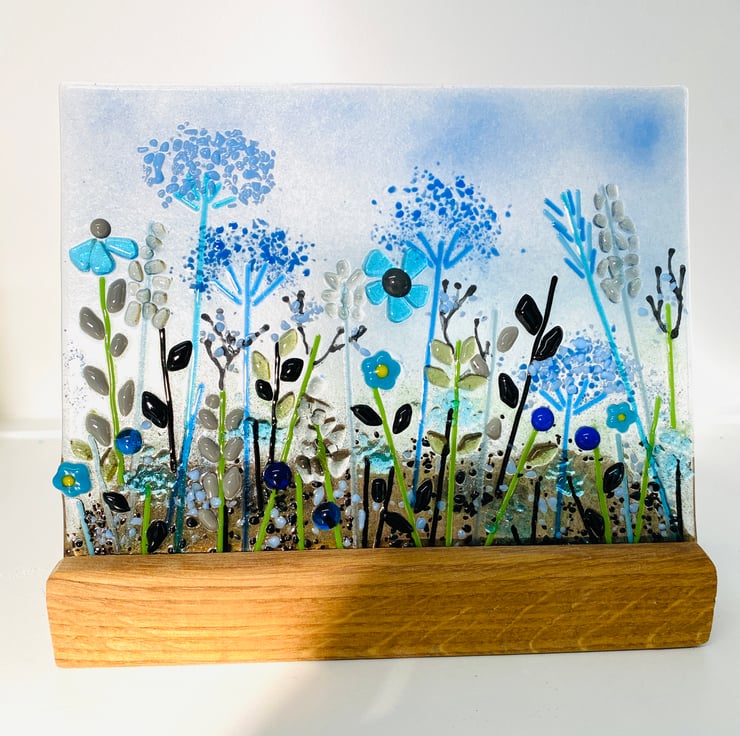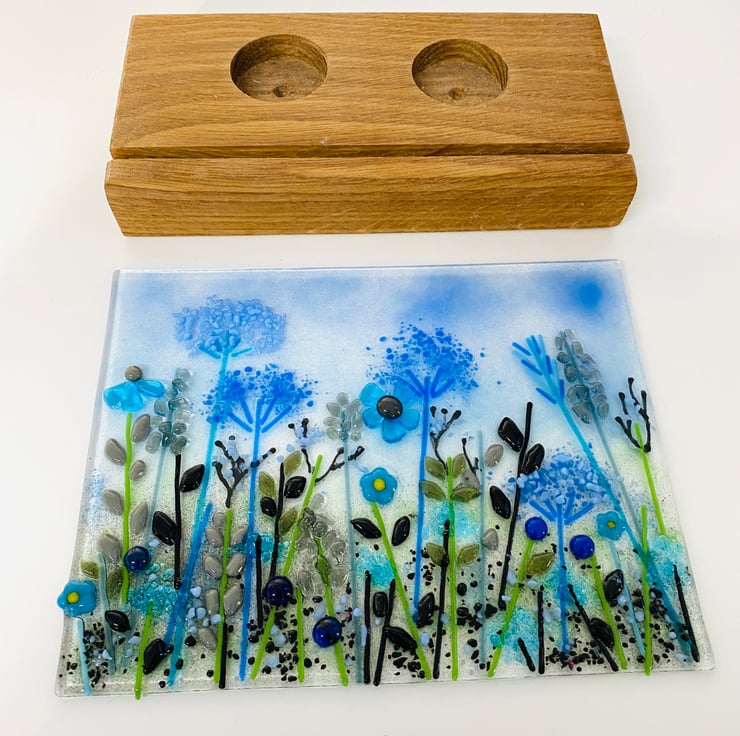 gorgeous way to add warmth and interest to your home . The fused glass panel is twice fused to build up glass powder and sheet glass in my kiln . The panel then slots into an oak base which duals in the evening as a candle screen . A perfect gift which comes apart for easy transportation and cleaning.