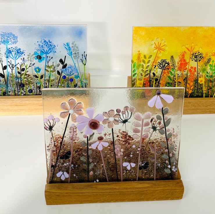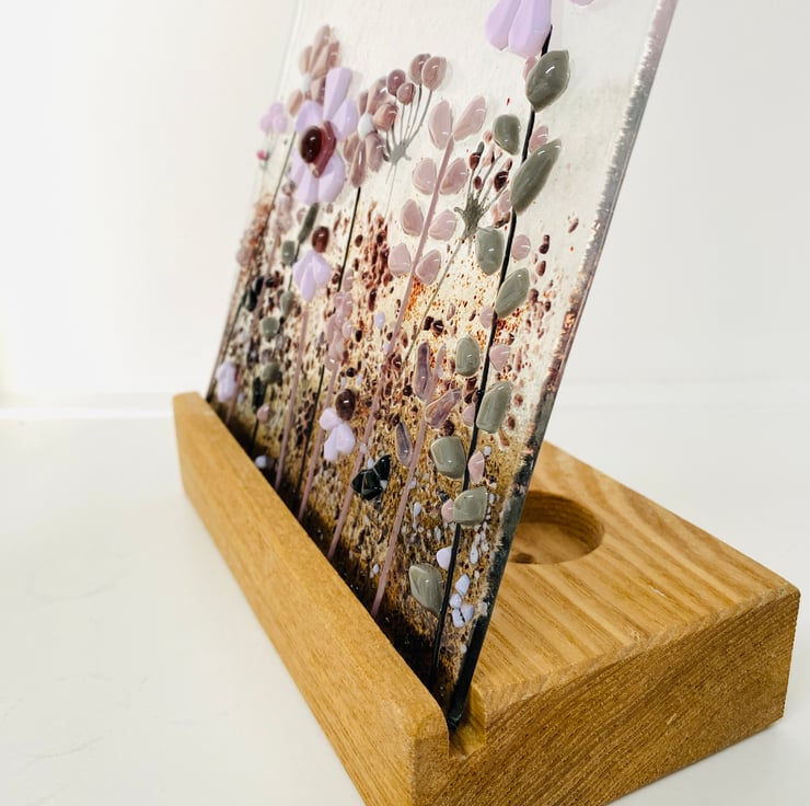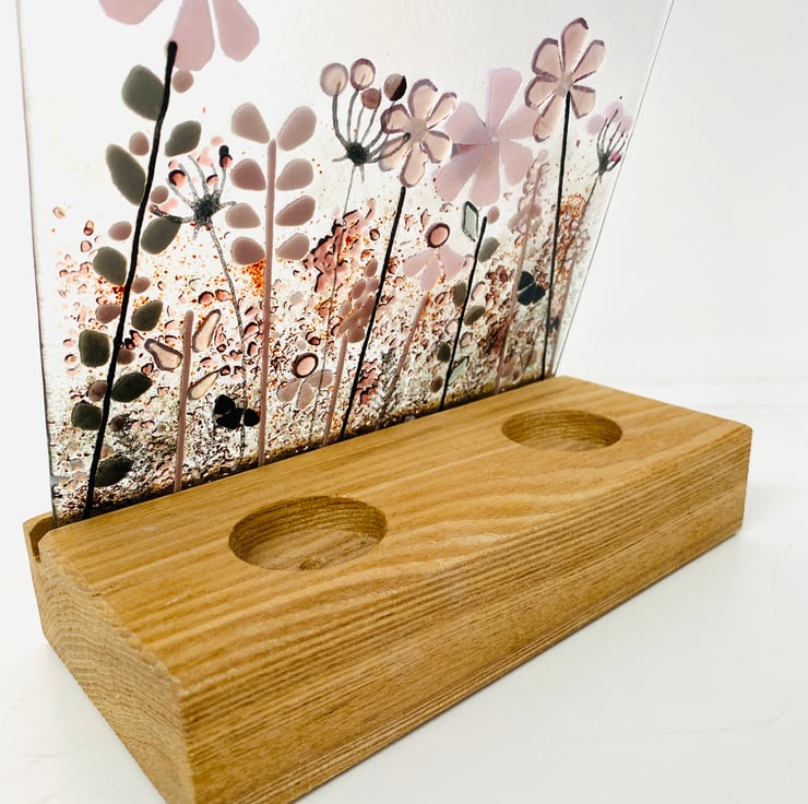 gorgeous way to add warmth and interest to your home . The fused glass panel is twice fused to build up glass powder and sheet glass in my kiln . The panel then slots into an oak base which duals in the evening as a candle screen . A perfect gift which comes apart for easy transportation and cleaning.
