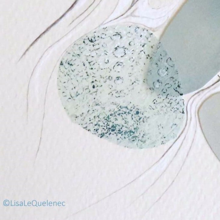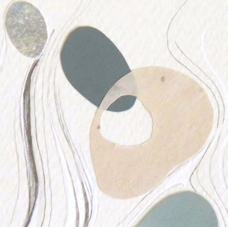 An original collage and mixed media artwork of pebbles on the shore depicting the slow erosion of wind and water on the coast. This piece shows a hag stone or holey stone amongst the pebbles, the light glinting off the sea and wind creating ripples on the tide in tones of cream, green and soft grey blue.