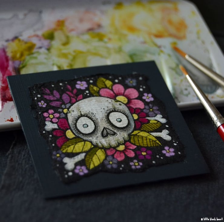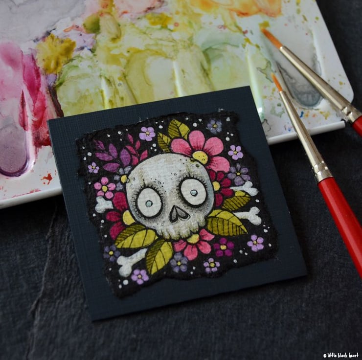 this is an original artwork in artists pens and watercolour pencils and paints, drawn on textured indian khadi paper, which is handmade from recycled cotton rag. the paper has been hand torn with an irregular edge, which I have then mounted to a twinchie painted with a paynes grey acrylic, to create a dark background.