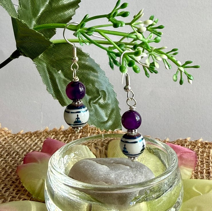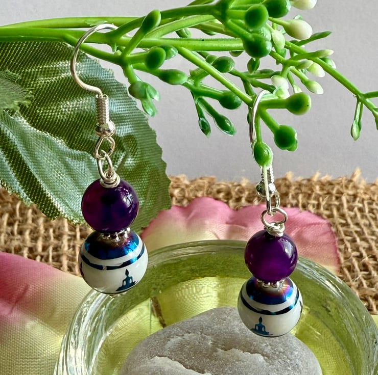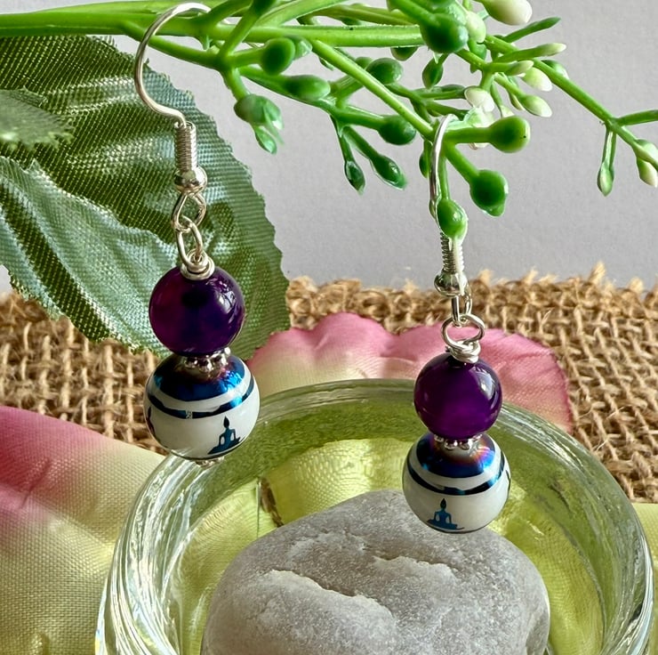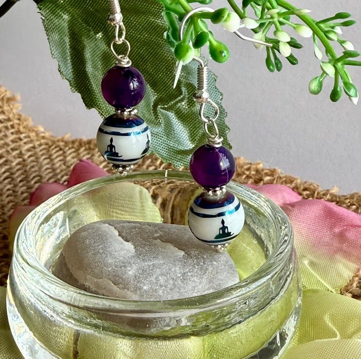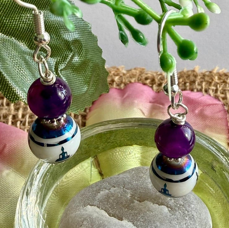 Beautiful glass beads with Buddha detail. Taking a colour from the bead I have colour matched with the added deep Purple Amethyst gemstone. The components are Silver Plated and Sterling Silver ear hooks.