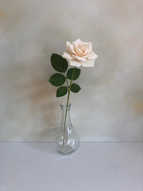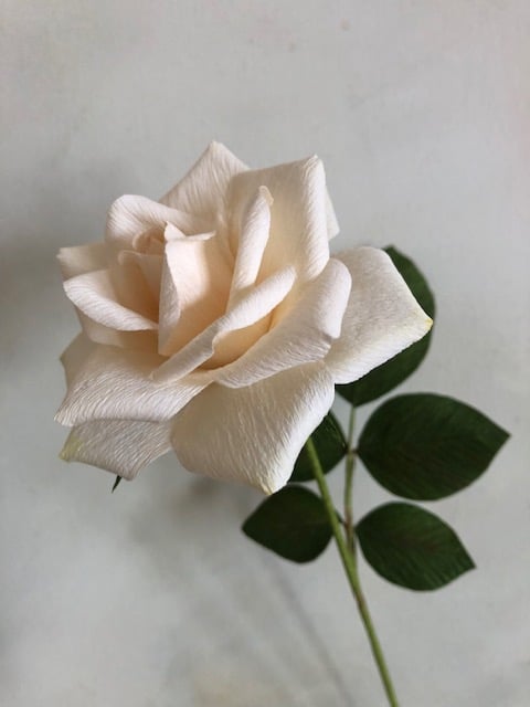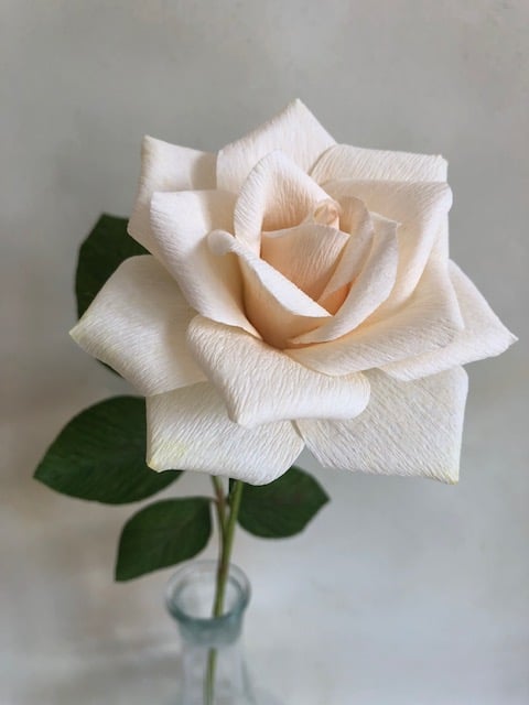In the language of flowers, roses symbolise love and beauty. Popular for weddings, the cream Sahara rose variety is tinged with hints of soft apricot and green. This paper version of the Sahara rose is crafted from the highest quality, FSC-certified crepe paper and artist-grade, light fast acrylic paint and pastels. Each part of the flower is painted, cut, shaped and assembled by hand, making every flower unique. A lovely gift or perfect for displaying in your home. Can be made in a colour of your choice - please feel free to message me to discuss. Should you require more flowers than the number listed, I would be happy to make additional ones for you. Paper flowers are handmade to order so there may be slight differences to images shown. Height approx. 38cm.