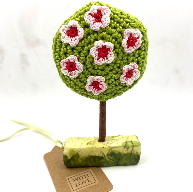 This double-sided spring tree decoration is crocheted in cotton and lined with two layers of craft felt. The trunk is made from a cotton yarn wrapped lolly stick and it stands in a base made from air dry clay covered in mulberry tissue paper. The tag reads ‘With love’ but this can be replaced by a tag with wording of your choice. The ornament stands approximately 12 cm tall and comes wrapped in tissue in a labelled PIP ( Postage in Proportion) box, all ready to be given or posted on.