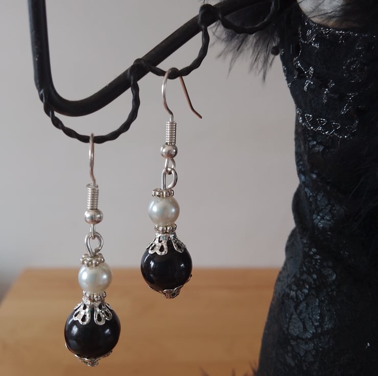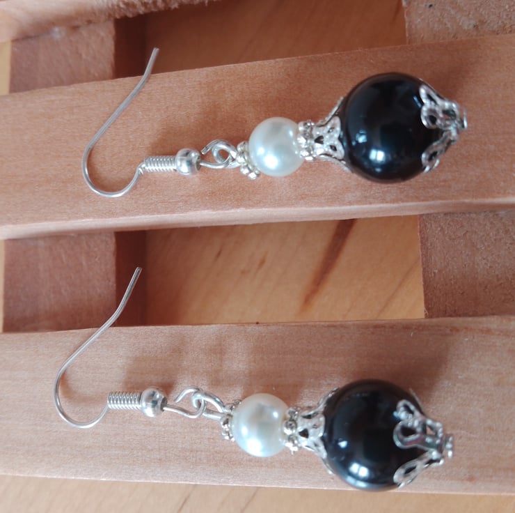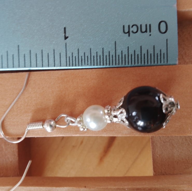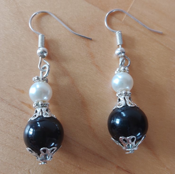 Handmade Black Glass Bead & Faux Glass Pearl with Silver Plated Attachments
