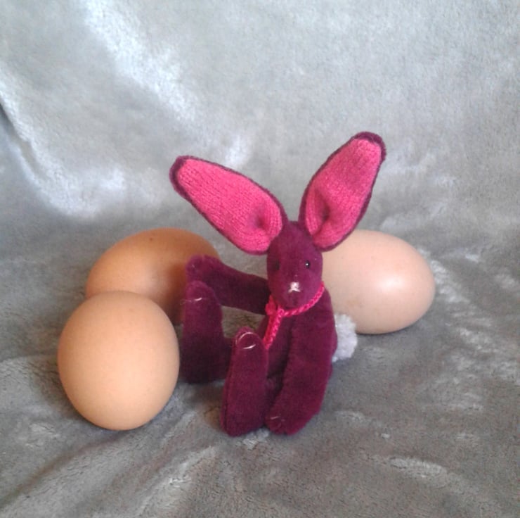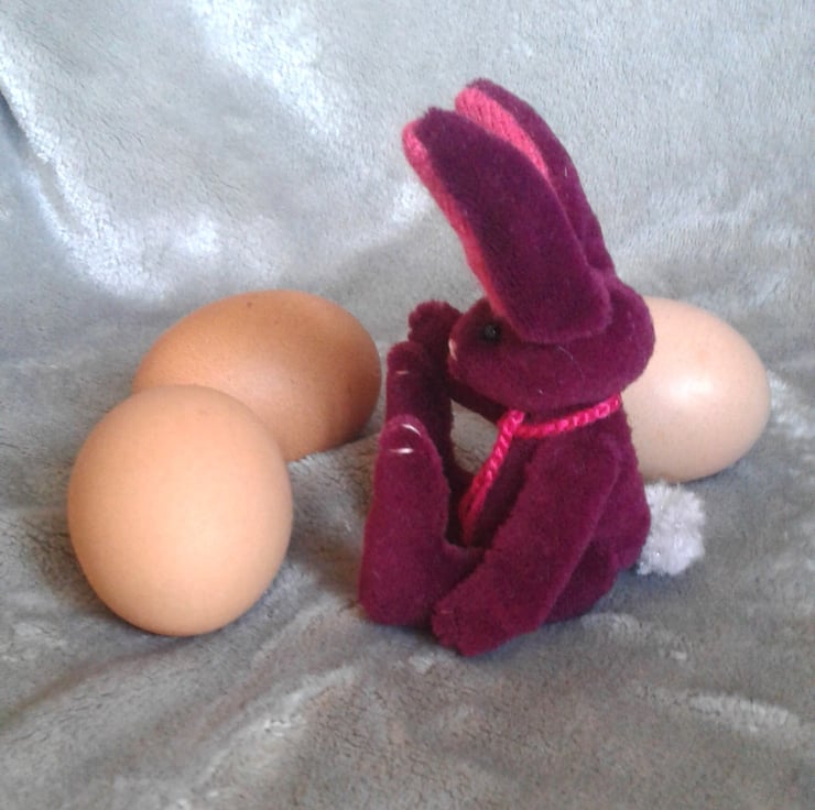 Plum is only 5.5 inches tall and quite a bit of that height is from his ears!. He is fully thread jointed so posable and gets up to allsorts of cheekiness. As you can see in the photos he has discovered some eggs in the pantry and is having a fine time climbing around.