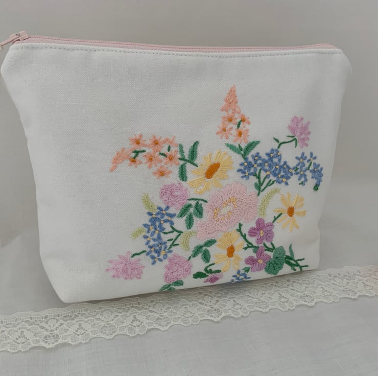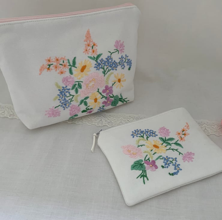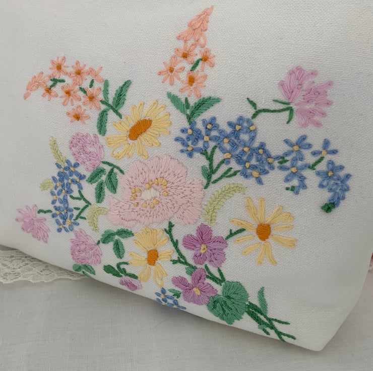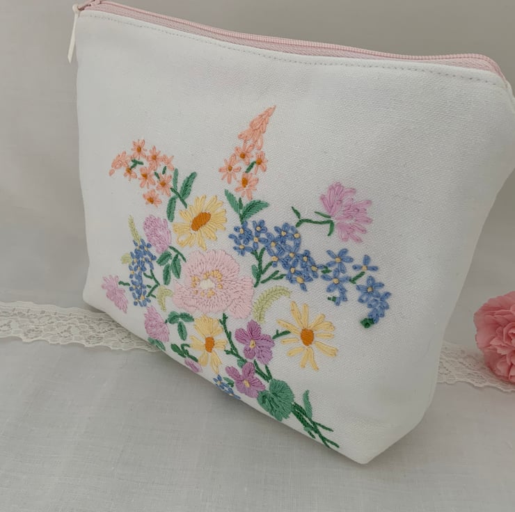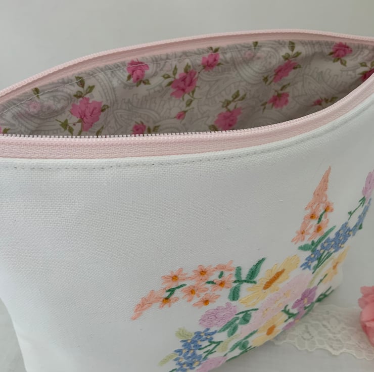 A beautiful cosmetic bag crafted from a vintage hand embroidered tablecloth which features an intricate floral stitching. The purse is lined in a pretty vintage floral cotton and in between is a layer of interlining which gives a little soft structure. A functional purse offering plenty of room to store your make up and small essentials. This purse is fastened with a pink zip finished with faux suede cord.