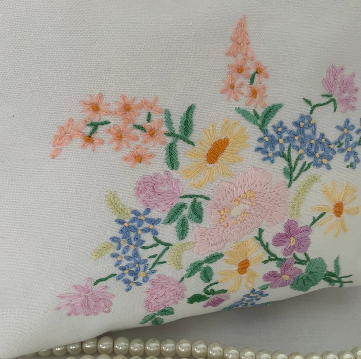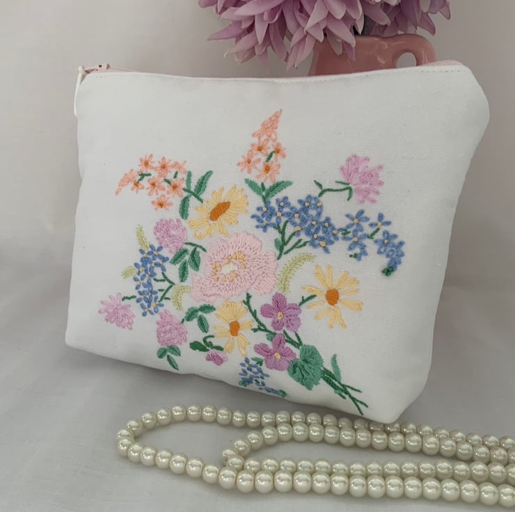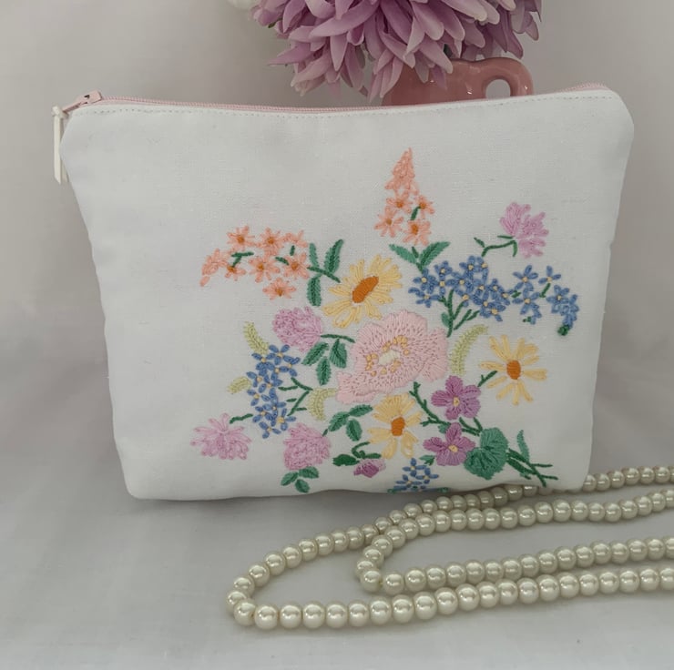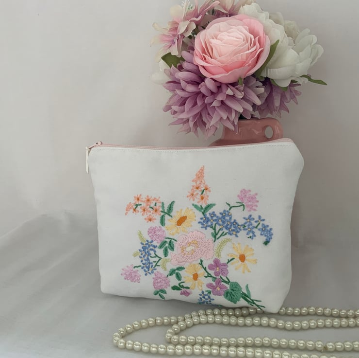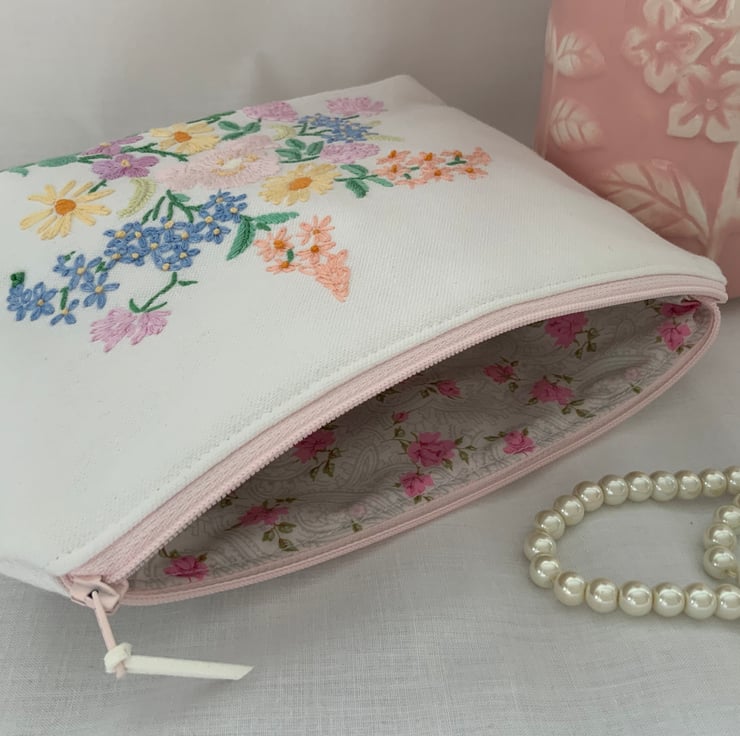 A beautiful cosmetic bag crafted from a vintage hand embroidered tablecloth which features an intricate floral stitching. The purse is lined in a pretty vintage floral cotton and in between is a layer of interlining which gives a little soft structure. A functional purse offering plenty of room to store your make up and small essentials. This purse is fastened with a pink zip finished with faux suede cord.