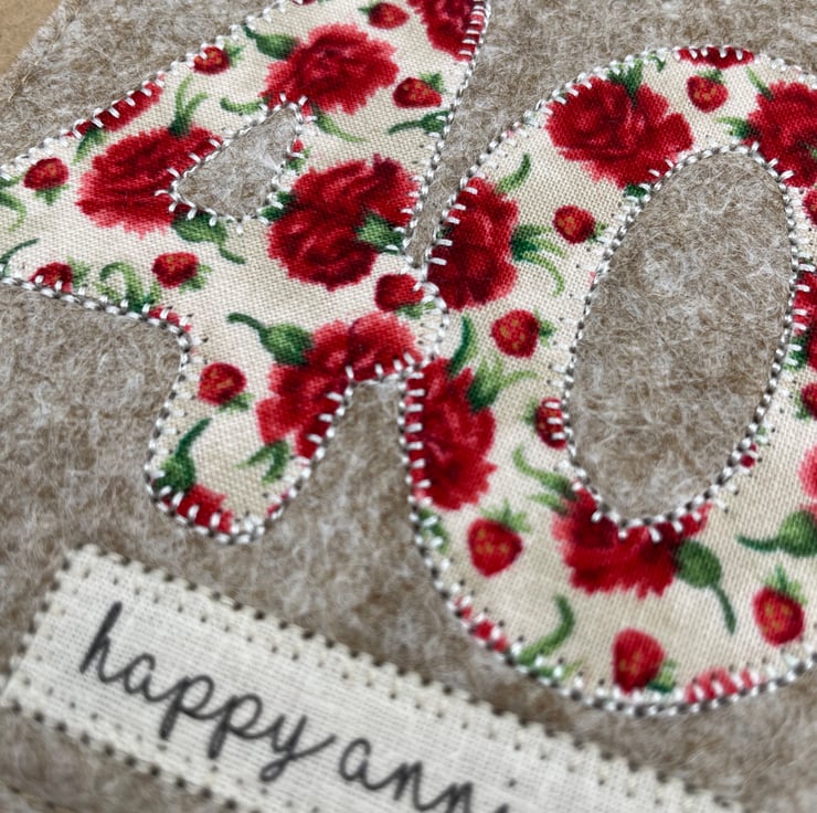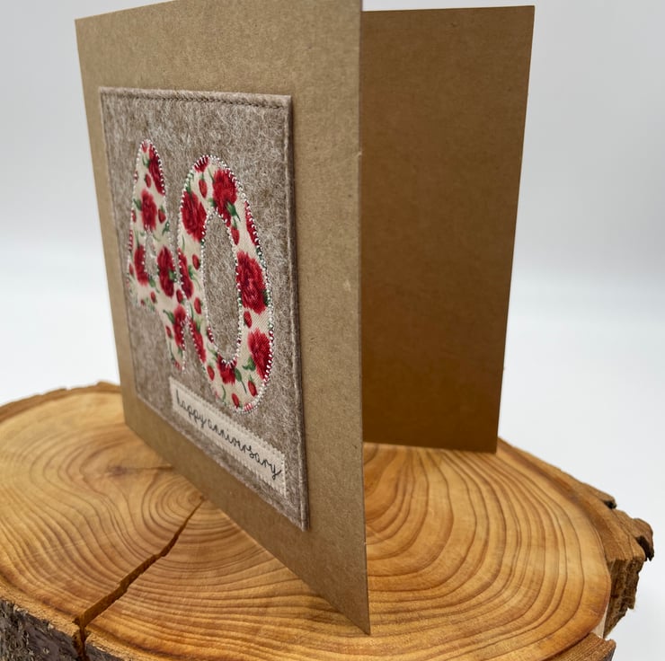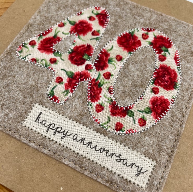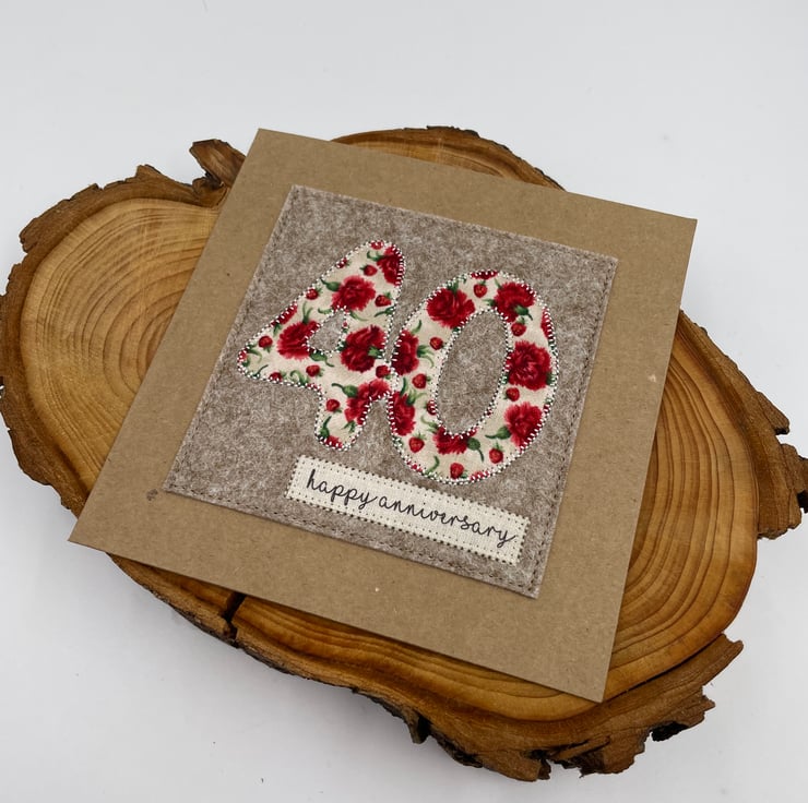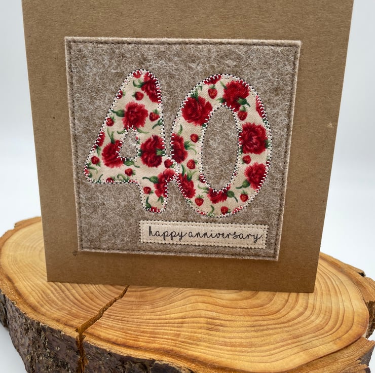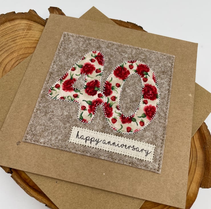 A heartfelt keepsake for a love that’s blossomed for 40 years! This beautiful handmade appliqué card features a striking ‘40’ crafted from pretty red rose fabric, symbolizing the joy and romance of a ruby wedding anniversary. Lovingly stitched onto soft woollen felt, with a delicate ‘Happy Anniversary’ message, it’s a thoughtful way to celebrate a truly special milestone.