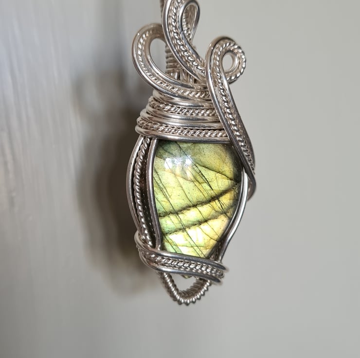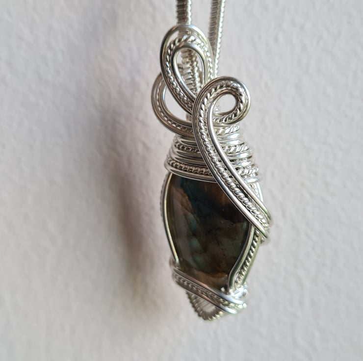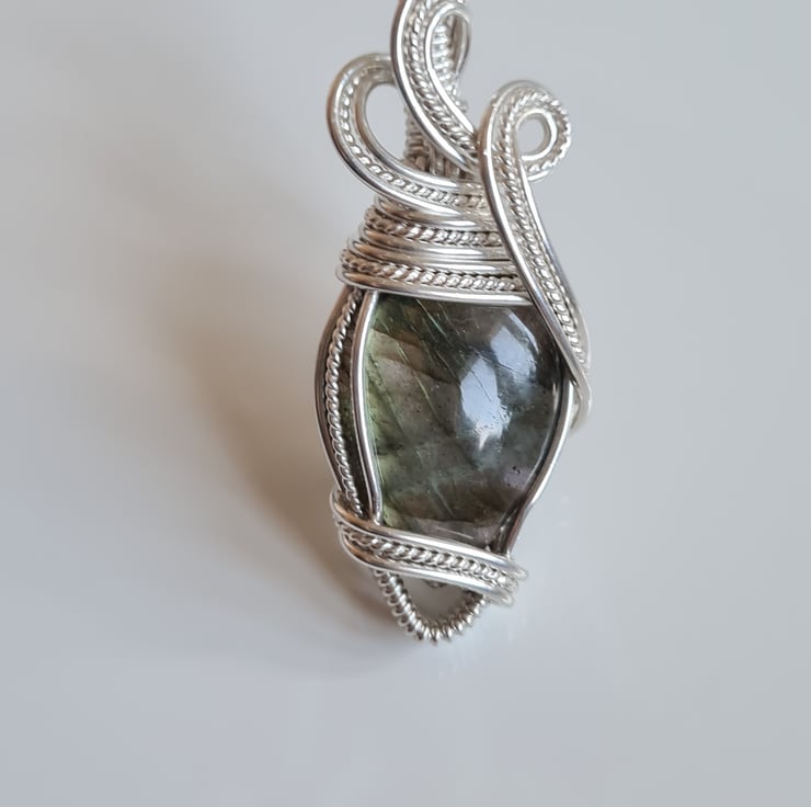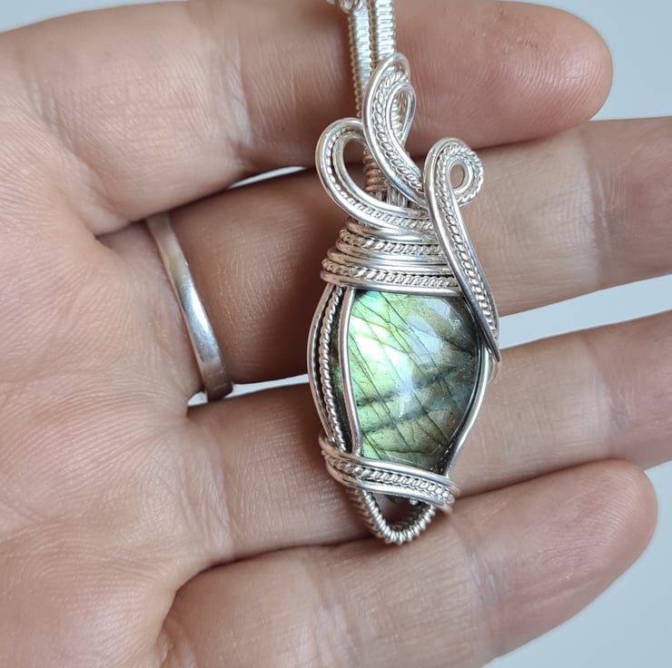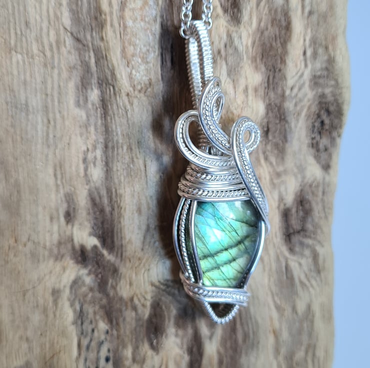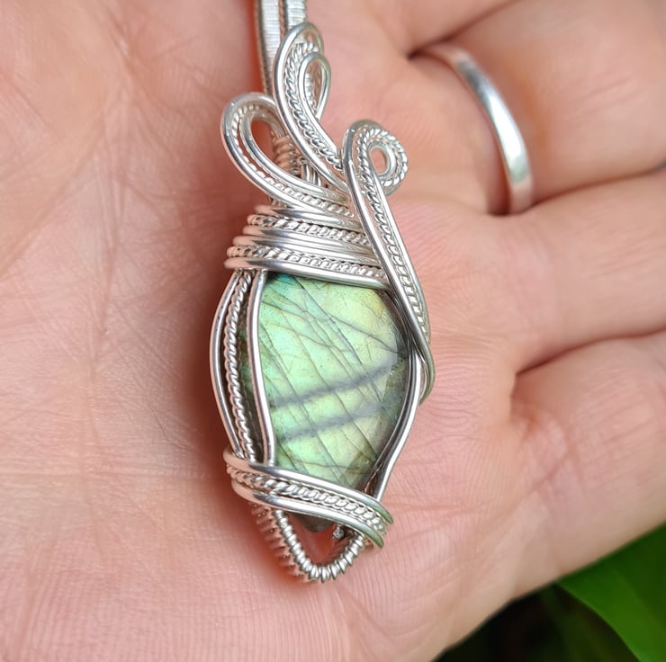 I have taken this very pretty and serene green Natural Labradorite crystal and I have wrapped it in 925 Silver to create this lovely elegant design. This stone has such a beautiful tone and looks beautiful teamed with the silver and it's a very calming crystal with a beautiful flash of colour