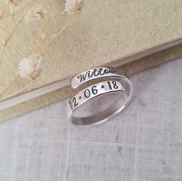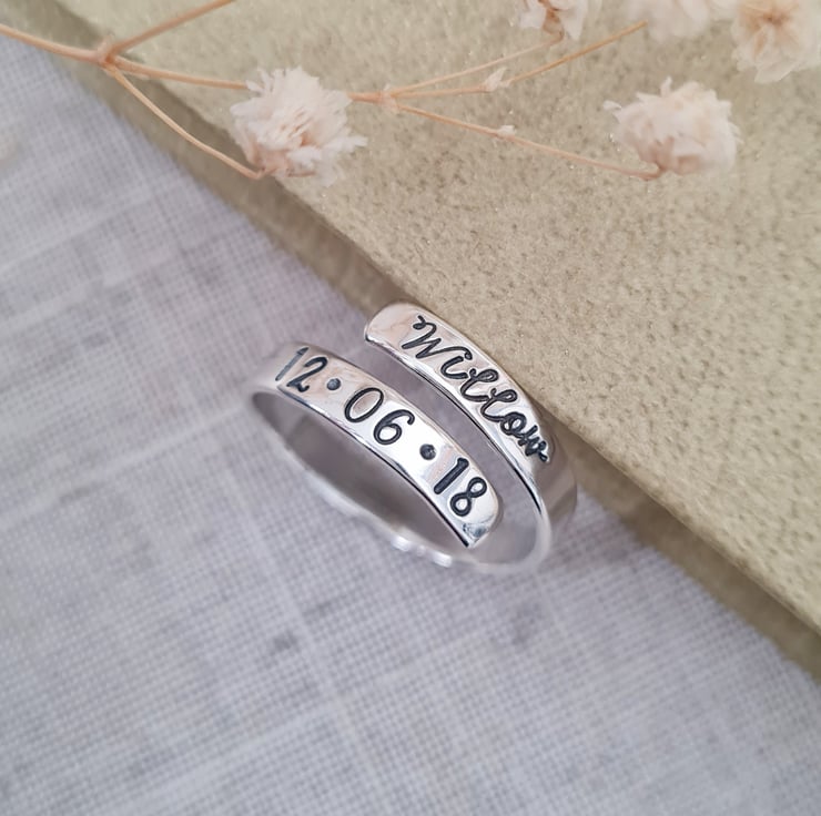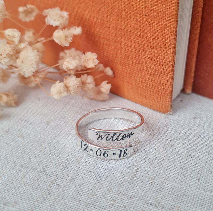 A perfect ring to celebrate the birth of your child or a very special person in your life, beautifully hand stamped on a sterling silver wrap ring.