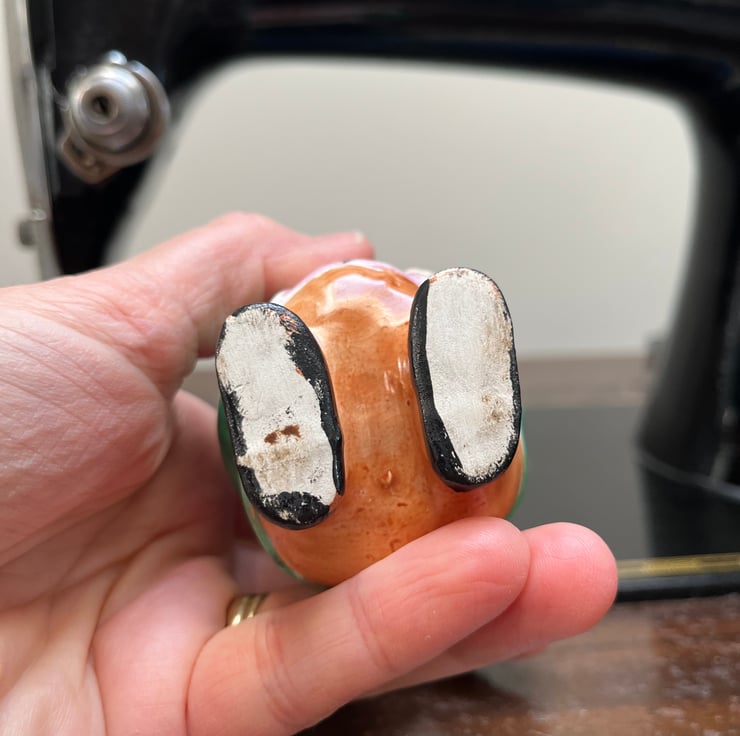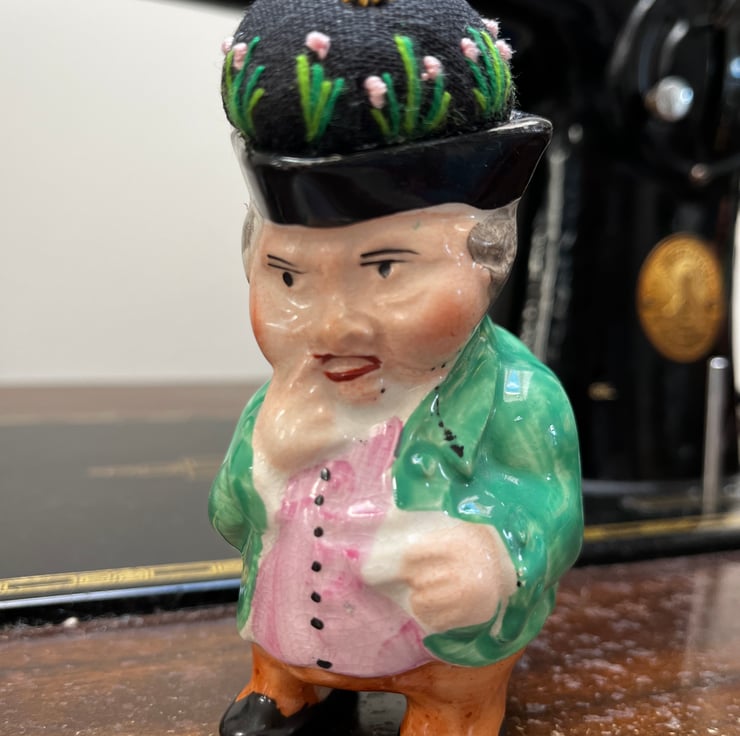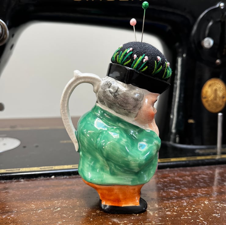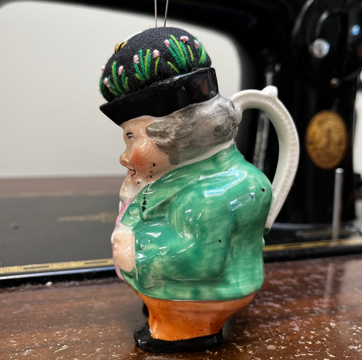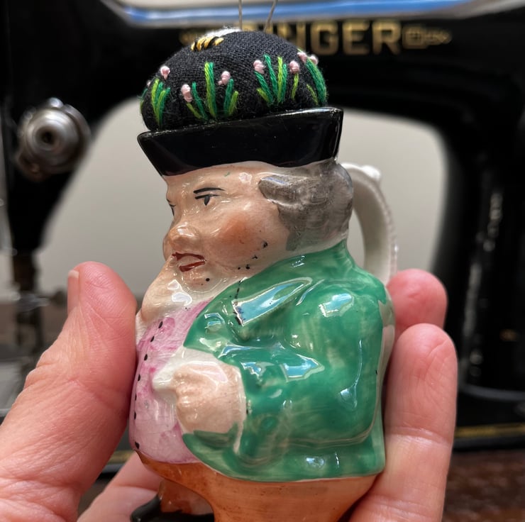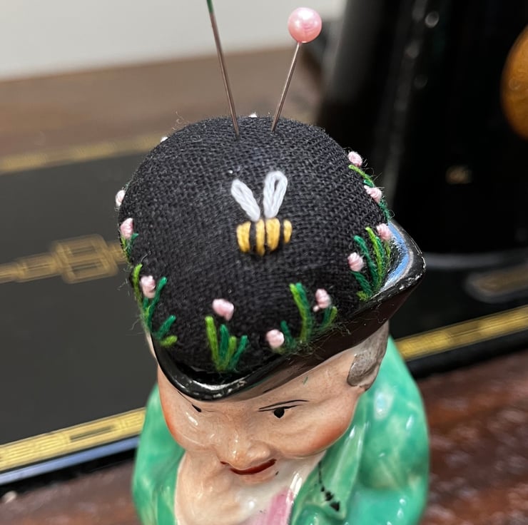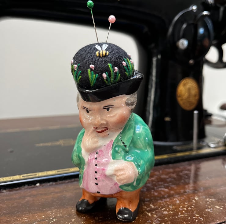 Pincushion in a vintage Toby jug. The black linen cushion has been embroidered with tiny flowers and a bee.