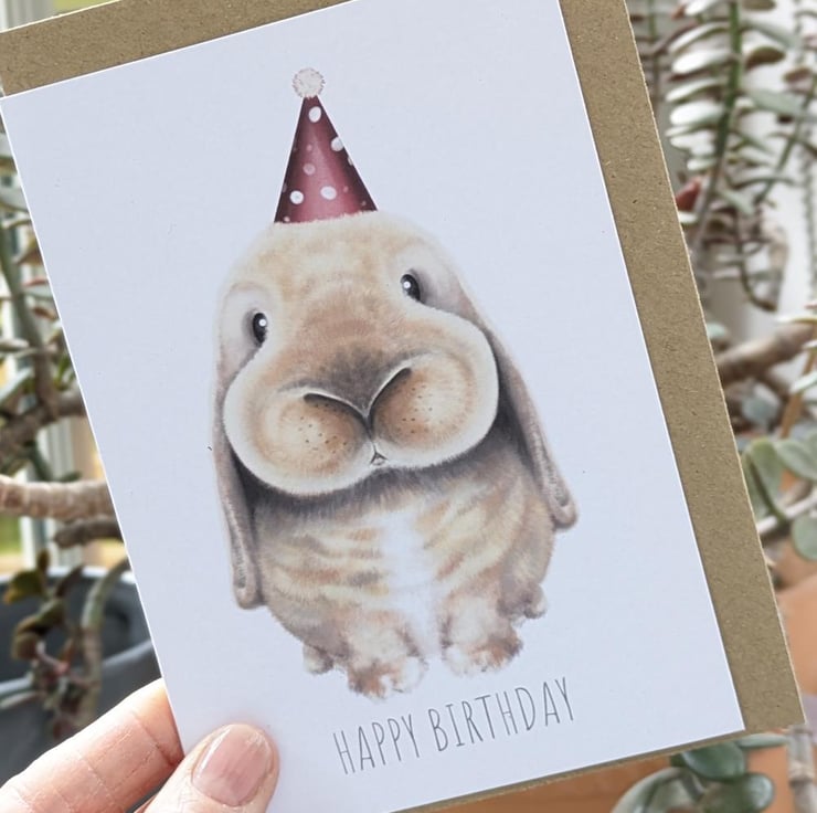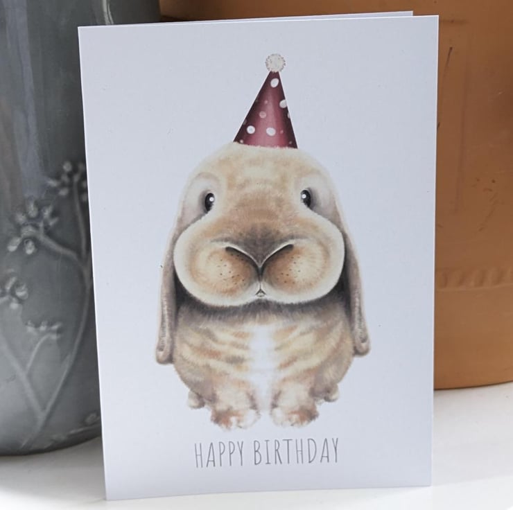 This cute, lop eared bunny is twitching it's nose, wearing his party hat and is ready to wish your loved one a very Happy Birthday. A fun birthday card for friends, daughters, sons, granddaughters or grandsons, nephews and nieces or even yourself.