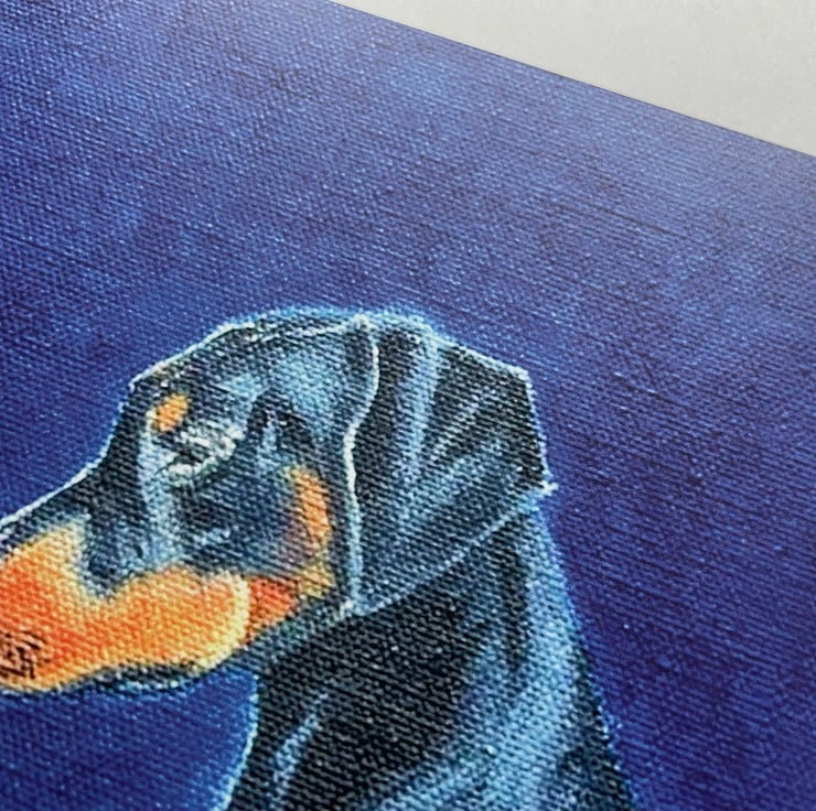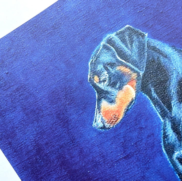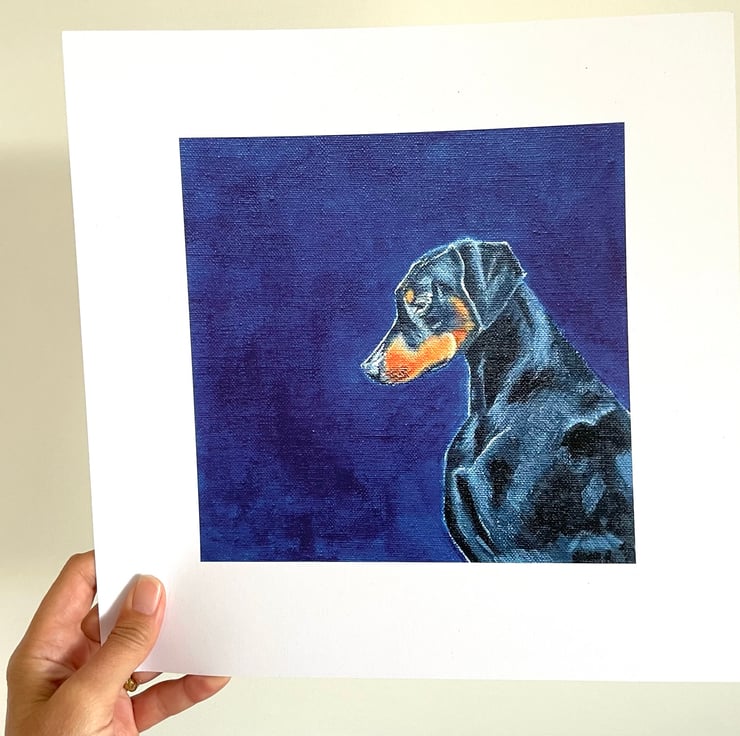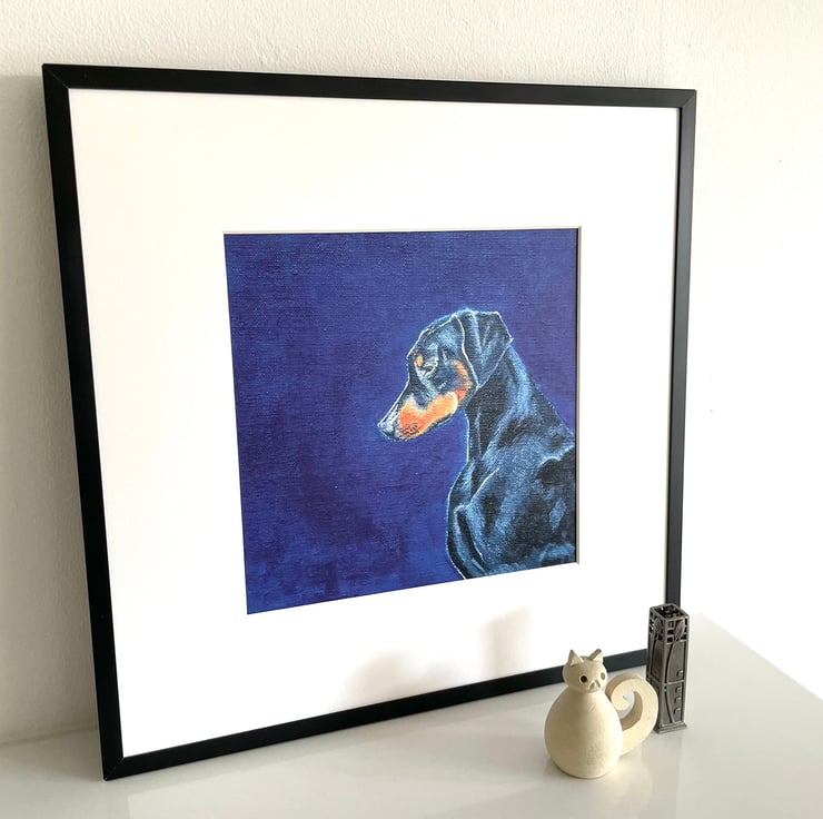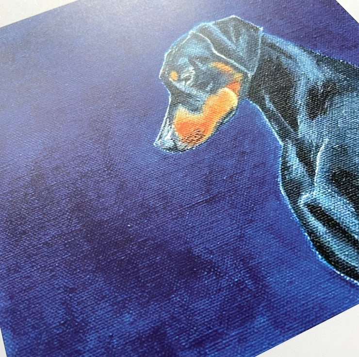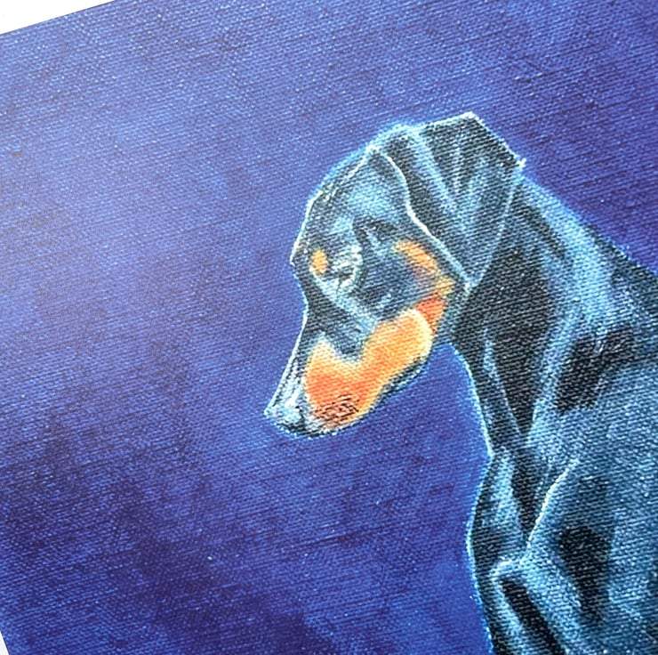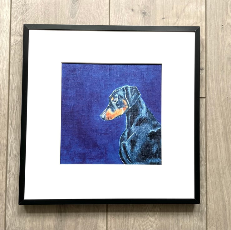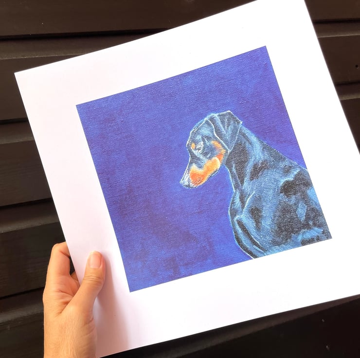 This is a high quality reproduction print of my original acrylic painting of 'Dobie' a Doberman Pinscher dog.