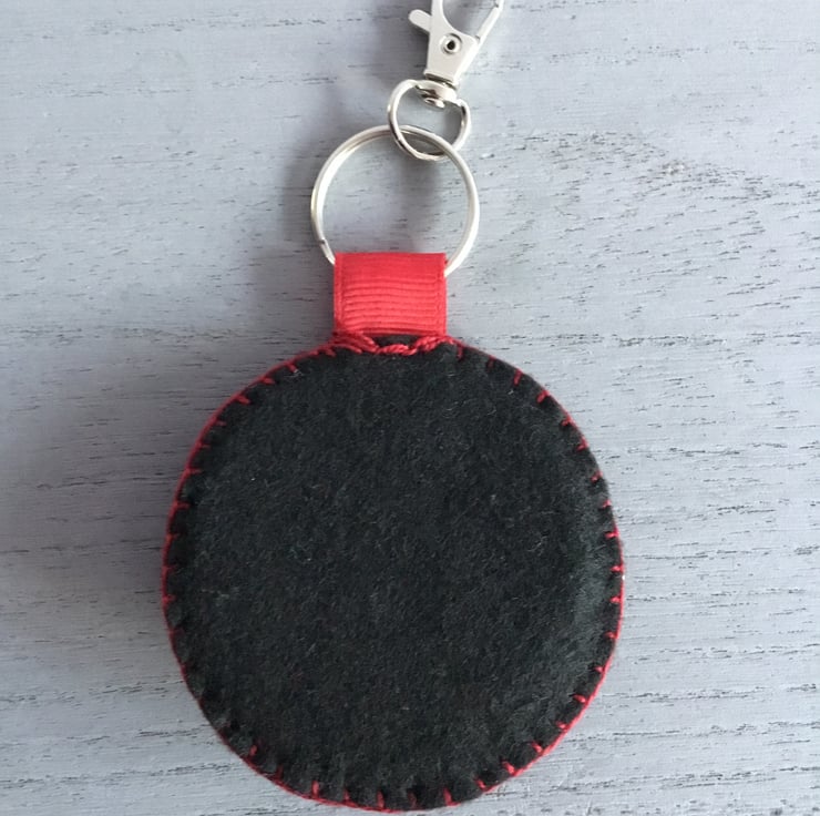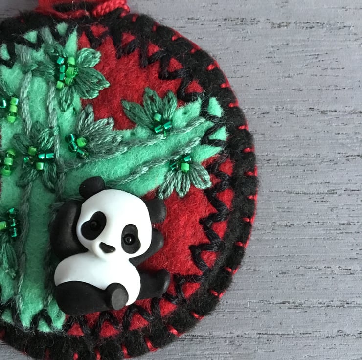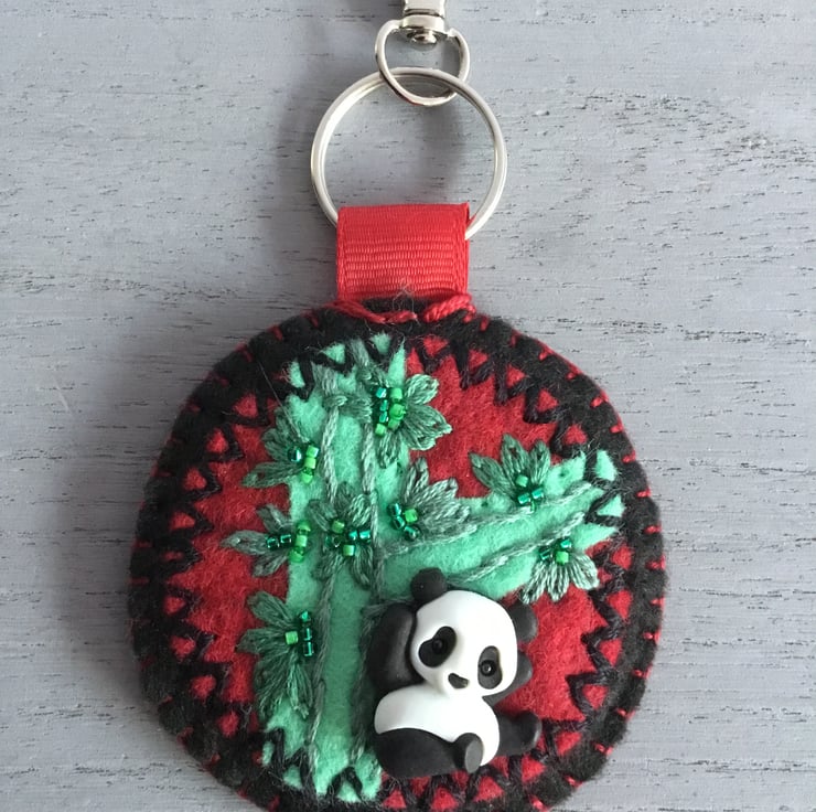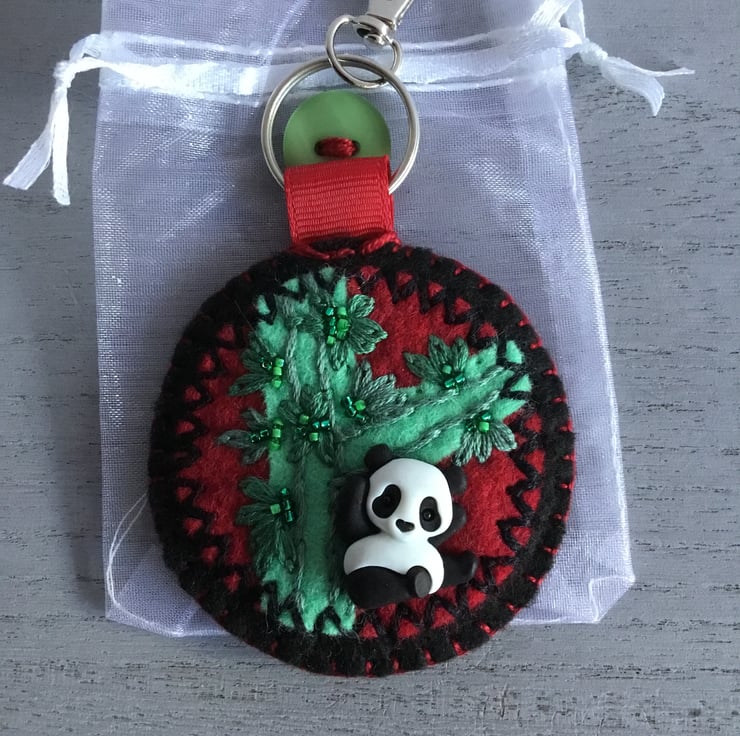 This Hand Embroidered Panda Keyring or Bag Charm has a hand embroidered scene of a Panda sitting under Bamboo stems and leaves. This scene is created by a Panda button sewn onto circles of red, black and green felt. Hand embroidered Lazy Daisy Stitches and green seed beads are sewn to make the Bamboo she sits beneath.