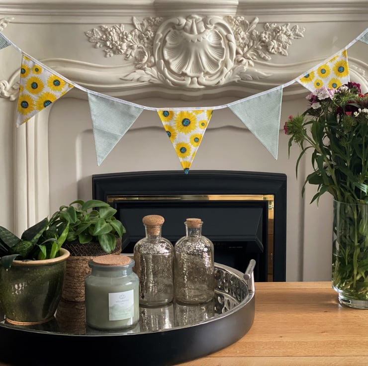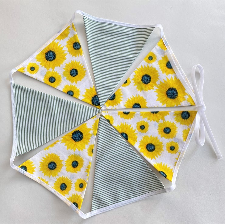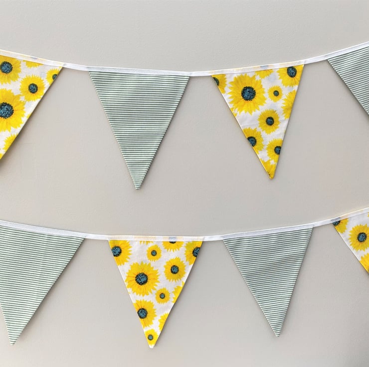 Bring a burst of sunshine into any space with this delightful Green Stripes and Yellow Sunflower Themed Fabric Bunting. Featuring 7 double-sided flags crafted from high-quality 100% cotton, this bunting is attached to a 1.95m length of white bias binding tape (with 1.55m from the first to the last flag). Each flag measures approximately 14cm by 17cm, with a 3cm gap between them, and the first and last flags are positioned about 35cm from the tape ends.